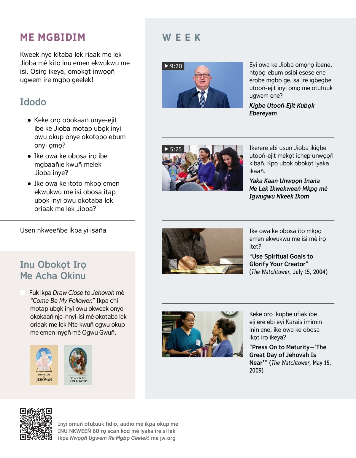 Eji mekup inye ikirọ ibe mgbaan̄je kiji melek Jioba ikinye. Bak me lek keke ni? “Inyi inu geege ikaben eji ìnan̄a me lek atikọ” kan̄. (Ebi Iburu 2:1) Keke obotap ubọk inyi eji ekup enye eketọbọ ebum enyi Jioba ni? Eji mekọt ikup inye me lek ikwaan̄ ilolook ata etip mè ikiweek ofifi ofifi oniin̄ eji ebesa ikisi ikwaan̄ inyi Awaji me ojot ojot. (Fuk Ebi Filipai 3:16.) Ikekitọbọ ebum inyi Jioba onwọn ichit!—Okwa Itọn̄ 84:10.