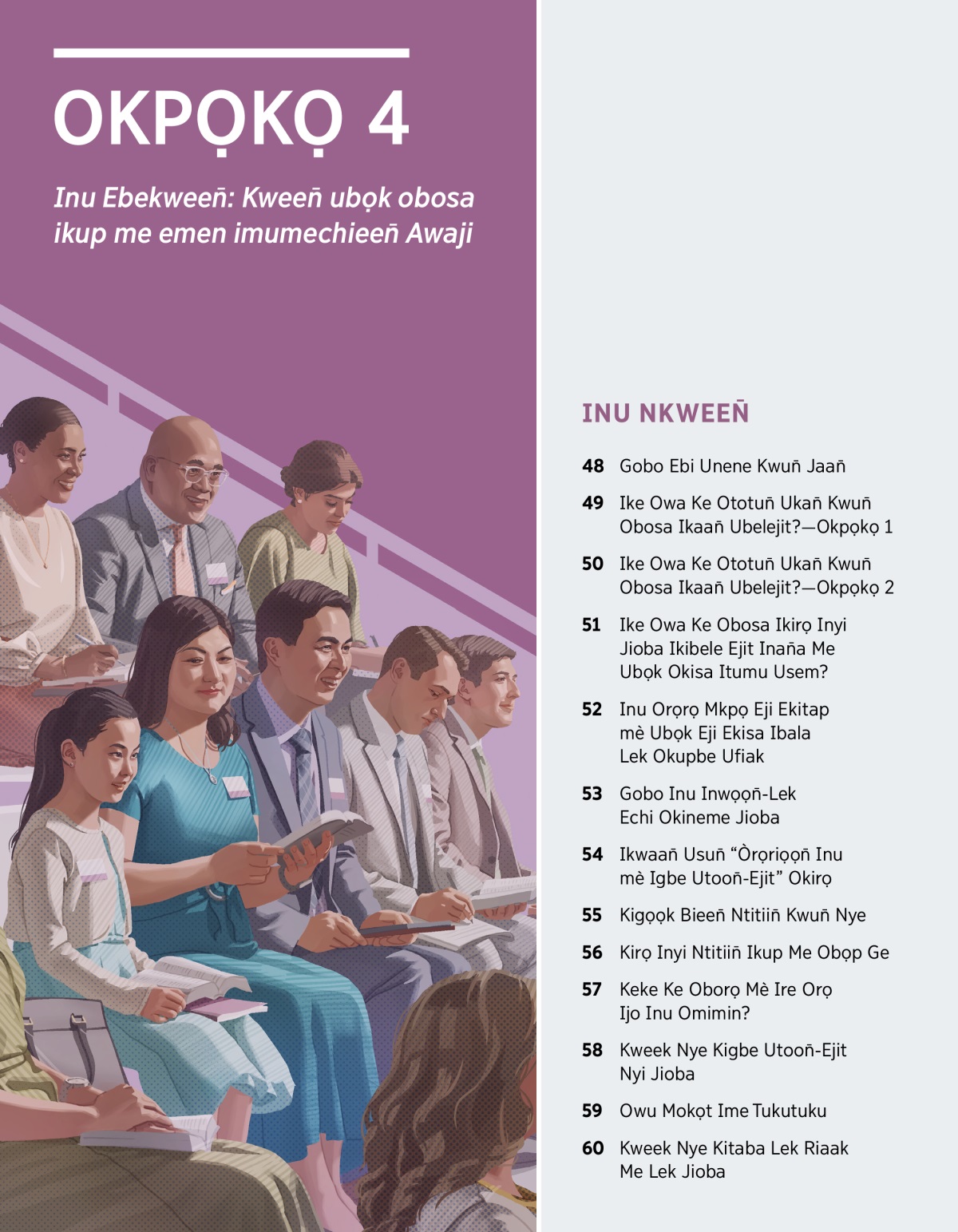 OKPỌKỌ 4 Printed Edition Inu Ebekween̄: Kween̄ ubọk obosa ikup me emen imumechieen̄ Awaji INU NKWEEN̄ 48 Gobo Ebi Unene Kwun̄ Jaan̄ 49 Ike Owa Ke Ototun̄ Ukan̄ Kwun̄ Obosa Ikaan̄ Ubelejit?—Okpọkọ 1 50 Ike Owa Ke Ototun̄ Ukan̄ Kwun̄ Obosa Ikaan̄ Ubelejit?—Okpọkọ 2 51 Ike Owa Ke Obosa Ikirọ Inyi Jioba Ikibele Ejit Inan̄a Me Ubọk Okisa Itumu Usem? 52 Inu Orọrọ Mkpọ Eji Ekitap mè Ubọk Eji Ekisa Ibala Lek Okupbe Ufiak 53 Gobo Inu Inwọọn̄-Lek Echi Okineme Jioba 54 Ikwaan̄ Usun̄ “Òrọriọọn̄ Inu mè Igbe Utoon̄-Ejit” Okirọ 55 Kigọọk Bieen̄ Ntitiin̄ Kwun̄ Nye 56 Kirọ Inyi Ntitiin̄ Ikup Me Obọp Ge 57 Keke Ke Oborọ Mè Ire Orọ Ijo Inu Omimin? 58 Kweek Nye Kigbe Utoon̄-Ejit Nyi Jioba 59 Owu Mokọt Ime Tukutuku 60 Kweek Nye Kitaba Lek Riaak Me Lek Jioba