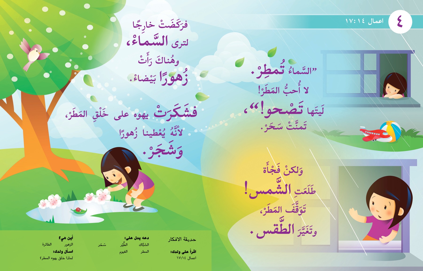 فشَكَرَتْ يهوه على خَلْقِ المَطَرْ،‏ لأنَّهُ يُعْطينا زُهورًا وَشَجَرْ.‏