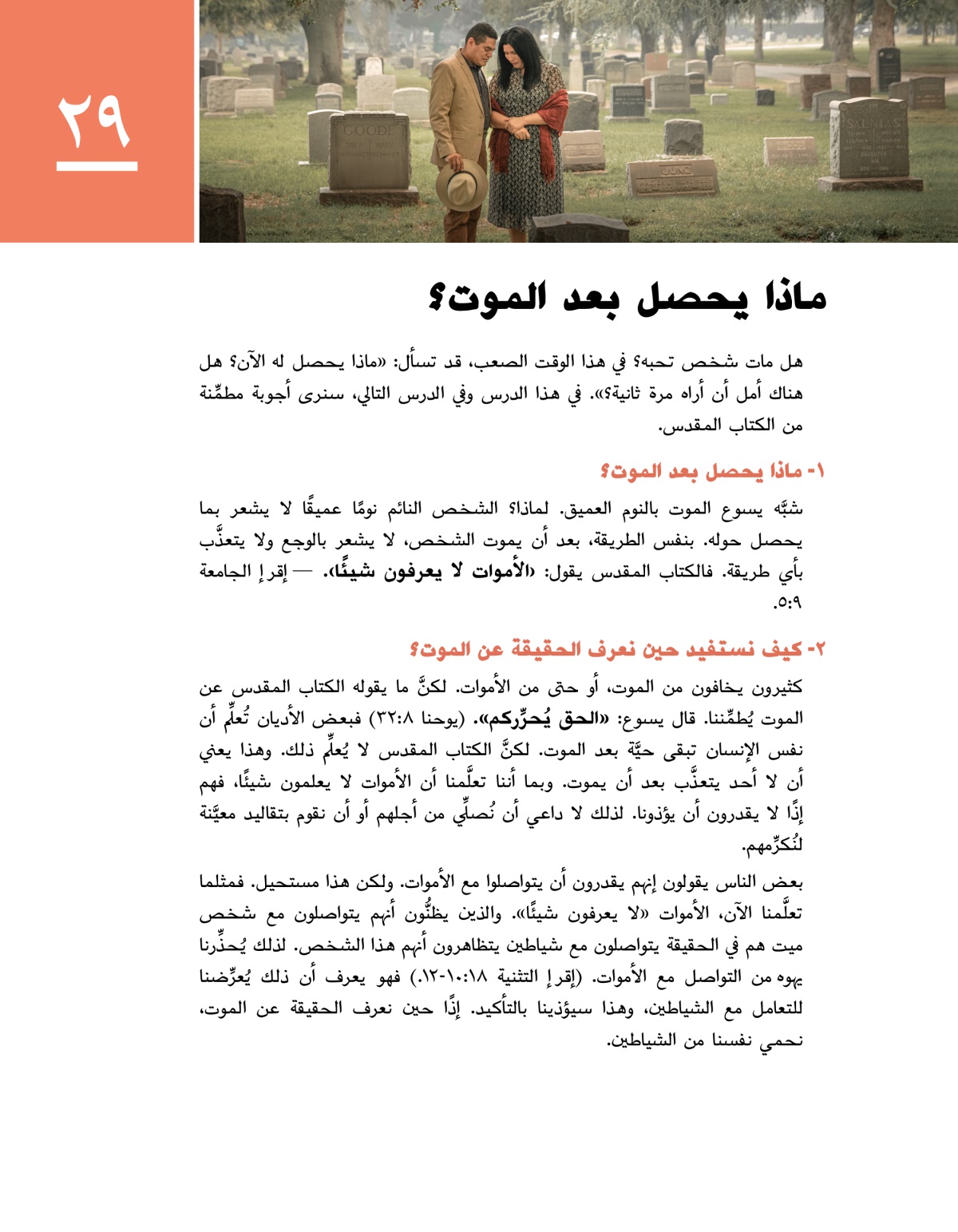 هل مات شخص تحبه؟ في هذا الوقت الصعب، قد تسأل: «ماذا يحصل له الآن؟ هل هناك أمل أن أراه مرة ثانية؟». في هذا الدرس وفي الدرس التالي، سنرى أجوبة مطمِّنة من الكتاب المقدس.