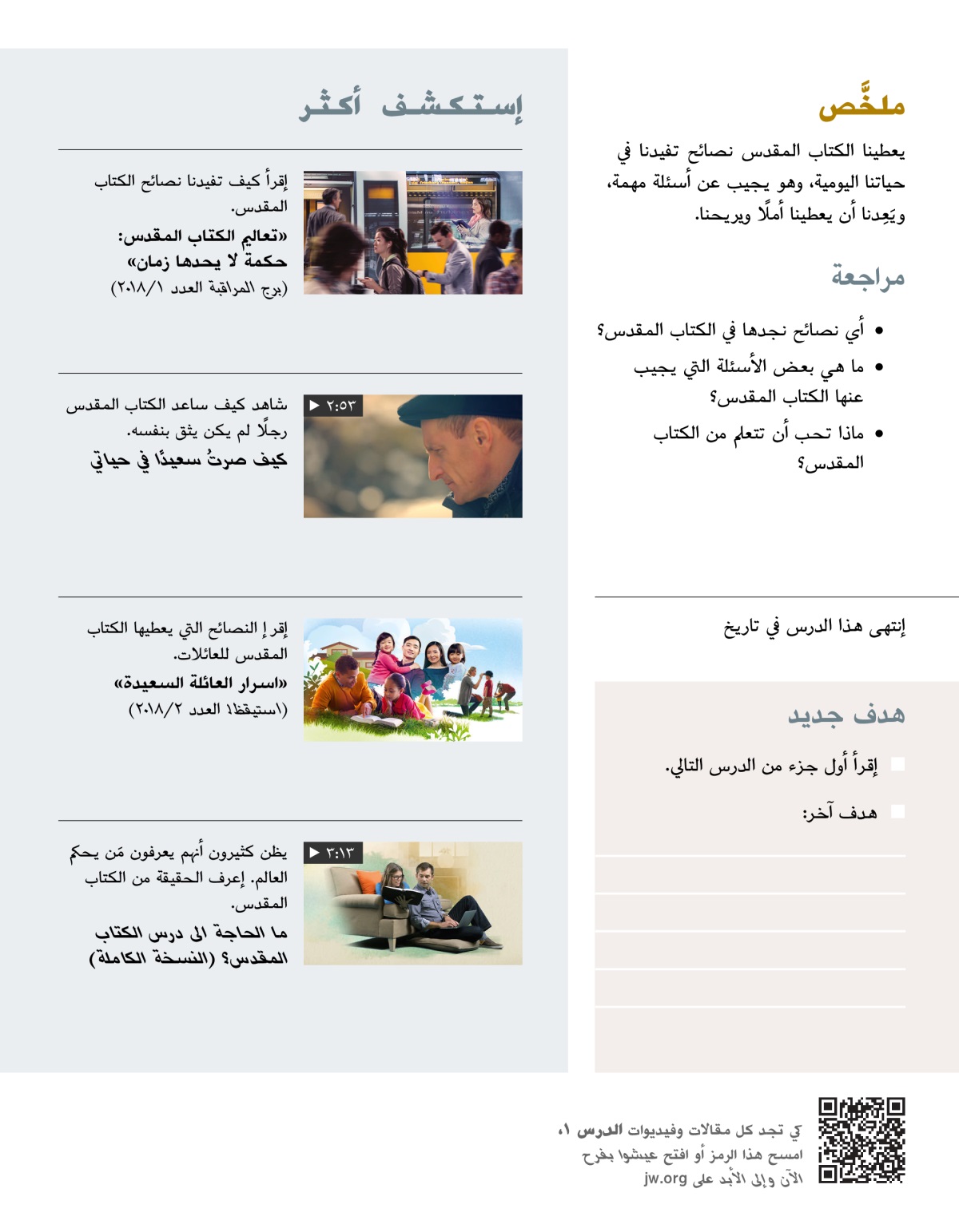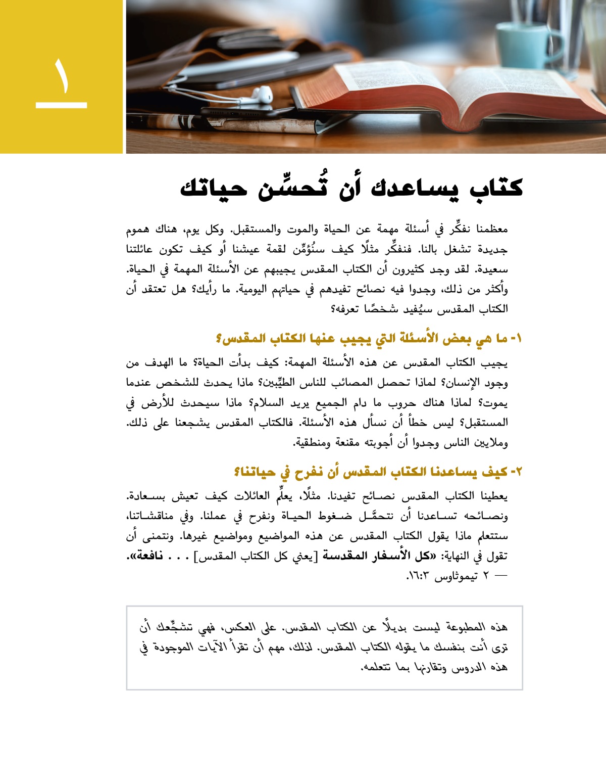 يعطينا الكتاب المقدس نصائح تفيدنا.‏ مثلًا،‏ يعلِّم العائلات كيف تعيش بسعادة.‏ ونصائحه تساعدنا أن نتحمَّل ضغوط الحياة ونفرح في عملنا.‏ وفي مناقشاتنا،‏ ستتعلم ماذا يقول الكتاب المقدس عن هذه المواضيع ومواضيع غيرها.‏ ونتمنى أن تقول في النهاية:‏ ‏«كل الأسفار المقدسة [يعني كل الكتاب المقدس] ‏.‏ .‏ .‏ نافعة».‏ —‏ ٢ تيموثاوس ٣:‏١٦‏.‏
