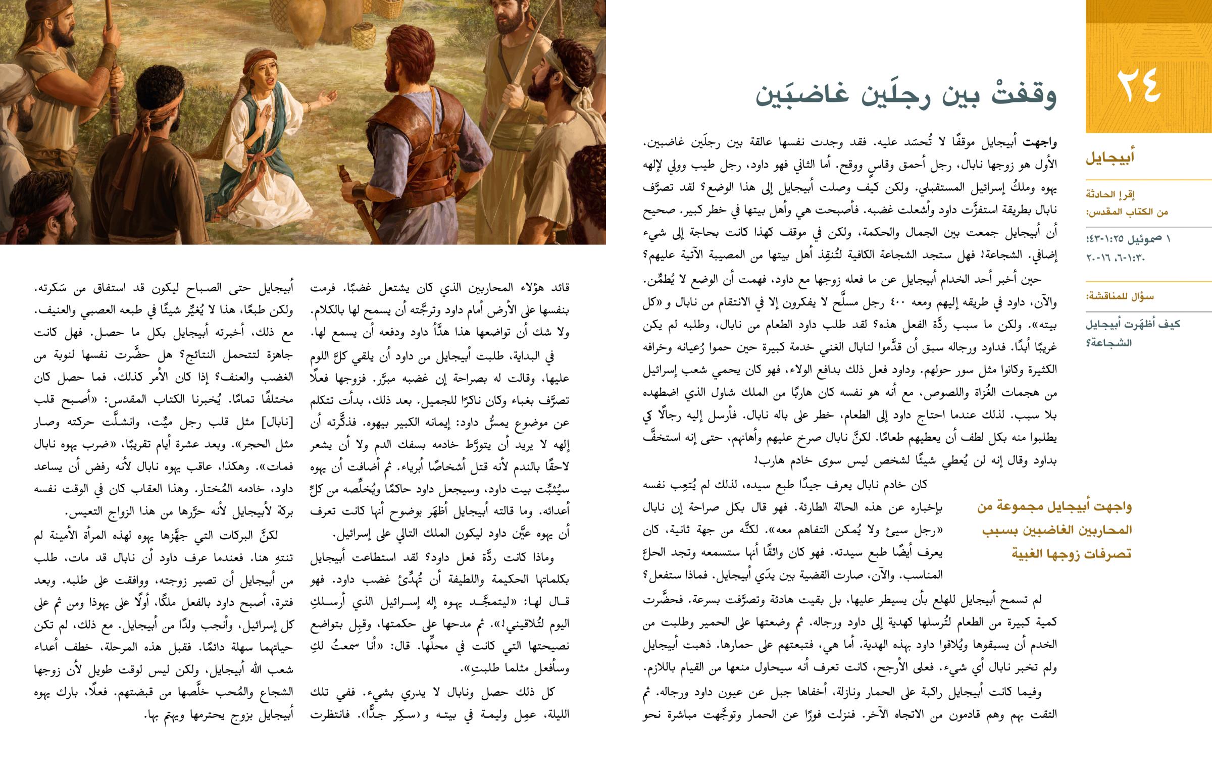 واجهت أبيجايل موقفًا لا تُحسَد عليه. فقد وجدت نفسها عالقة بين رجلَين غاضبين. الأول هو زوجها نابال، رجل أحمق وقاسٍ ووقح. أما الثاني فهو داود، رجل طيب وولي لإلهه يهوه وملكُ إسرائيل المستقبلي. ولكن كيف وصلت أبيجايل إلى هذا الوضع؟ لقد تصرَّف نابال بطريقة استفزَّت داود وأشعلت غضبه. فأصبحت هي وأهل بيتها في خطر كبير. صحيح أن أبيجايل جمعت بين الجمال والحكمة، ولكن في موقف كهذا كانت بحاجة إلى شيء إضافي. الشجاعة! فهل ستجد الشجاعة الكافية لتُنقِذ أهل بيتها من المصيبة الآتية عليهم؟