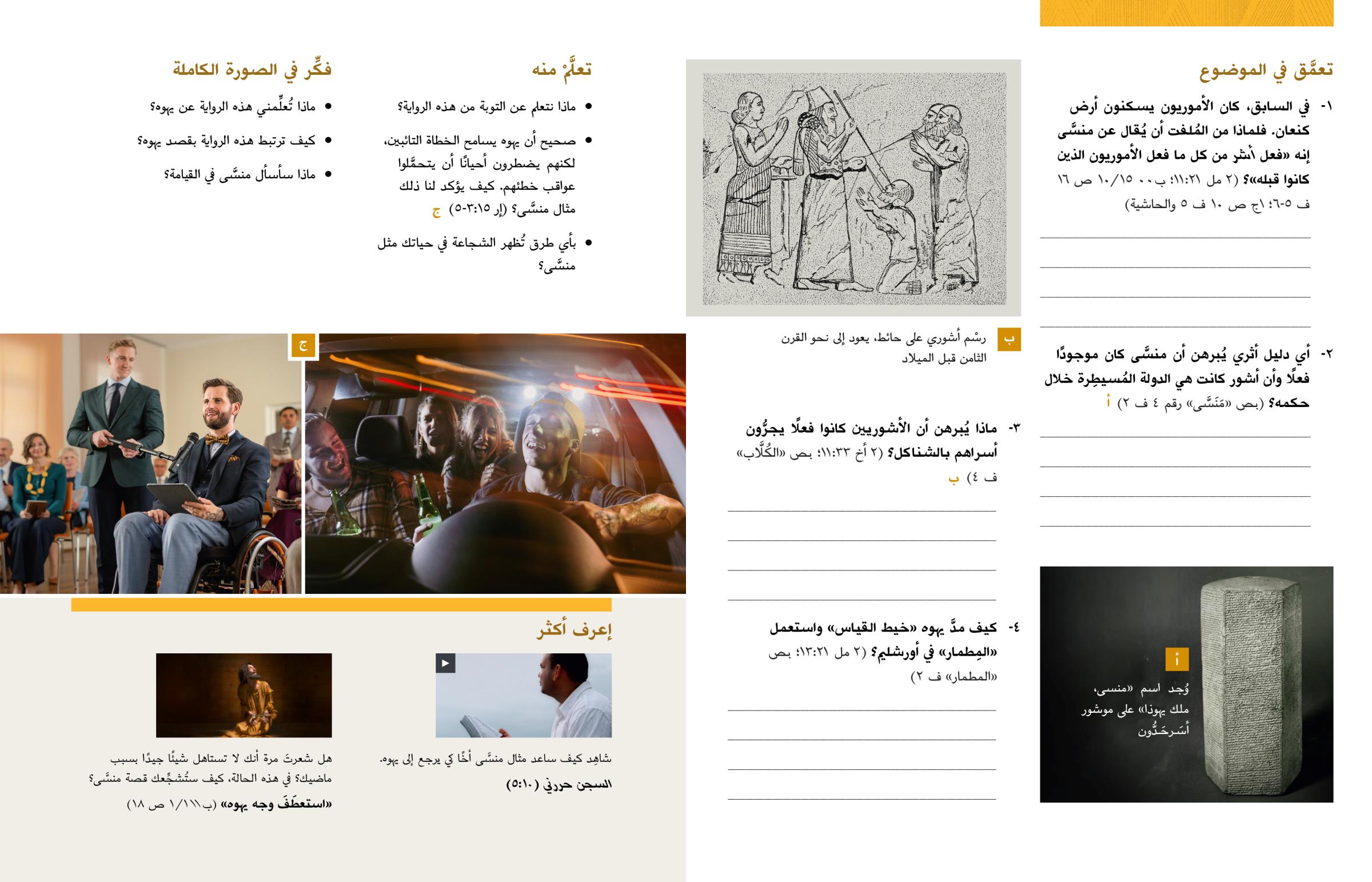١- في السابق، كان الأموريون يسكنون أرض كنعان. فلماذا من المُلفت أن يُقال عن منسَّى إنه «فعل أشر من كل ما فعل الأموريون الذين كانوا قبله»؟ (٢ مل ٢١:١١؛ ب٠٠ ١٥/١٠ ص ١٦ ف ٥-٦؛ اج ص ١٠ ف ٥ والحاشية)