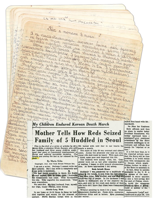 سنة ١٩٤١، انتقلتُ الى كوريا حيث تزوجت برجل روسي لطيف اسمه ايڤان. وفي سيول انجبنا ثلاثة اولاد: ابنتنا أوليا (١٩٤٢)، ابننا كوليا (١٩٤٥)، وابننا جورا (١٩٤٨). كان زوجي يملك محلا تجاريا، وعملت انا في الخياطة. ورغم اننا تكلمنا الروسية في البيت، تعلَّم اولادنا اليابانية منذ الصغر لأن سيول كانت تحت الاحتلال الياباني. وقد بدا ان السلام سائد في هذه المدينة بين السوفياتيين والاميركيين والكوريين. وكان يتردد الى متجرنا زبائن من كل هذه الجنسيات.