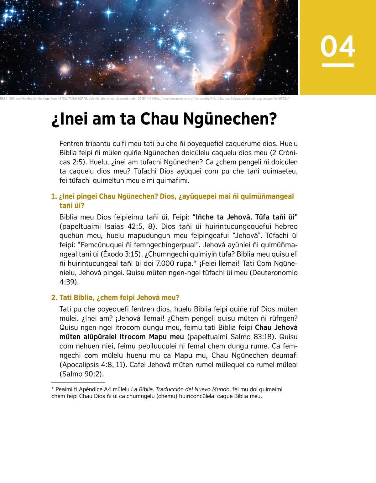 a Peaimi ti Apéndice A4 mülelu La Biblia. Traducción del Nuevo Mundo, fei mu doi quimaimi chem feipi Chau Dios ñi üi ca chumngelu (chemu) huiriconcülelai caque Biblia meu.