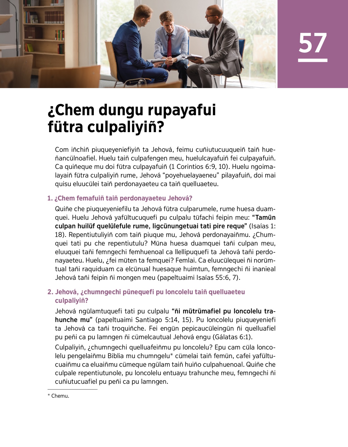 Quiñe che piuqueyeniefilu ta Jehová fütra culparumele, rume huesa duamquei. Huelu Jehová yafültucuquefi pu culpalu tüfachi feipin meu: “Tamün culpan huilüf quelülefule rume, ligcünungetuai tati pire reque” (Isaías 1:18). Repentiutuliyiñ com taiñ piuque mu, Jehová perdonayaiñmu. ¿Chumquei tati pu che repentiutulu? Müna huesa duamquei tañi culpan meu, eluuquei tañi femngechi femhuenoal ca llellipuquefi ta Jehová tañi perdonayaeteu. Huelu, ¿fei müten ta femquei? Femlai. Ca eluucülequei ñi norümtual tañi raquiduam ca elcünual huesaque huimtun, femngechi ñi inanieal Jehová tañi feipin ñi mongen meu (papeltuaimi Isaías 55:6, 7).