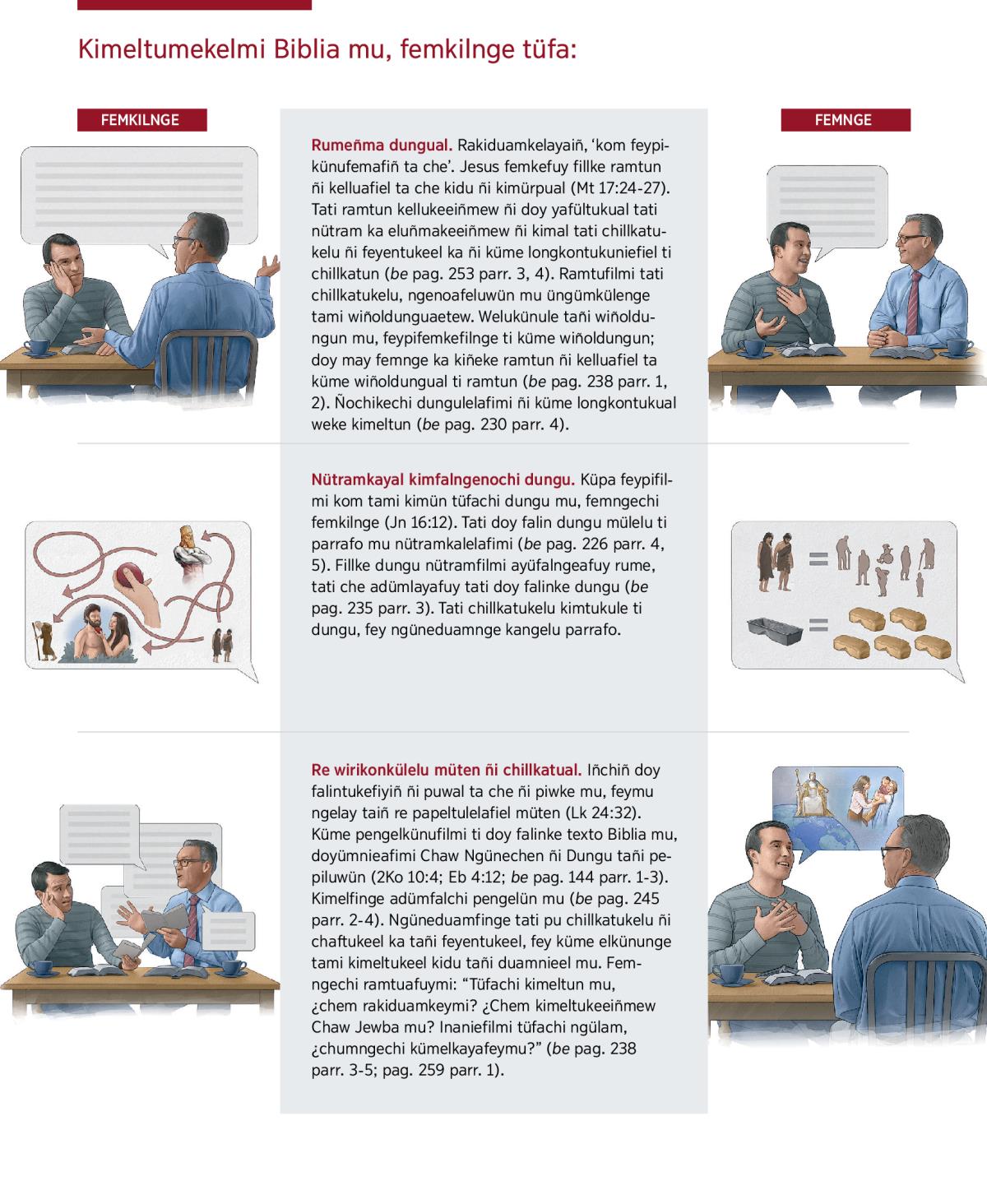 Re wirikonkülelu müten ñi chillkatual. Iñchiñ doy falintukefiyiñ ñi puwal ta che ñi piwke mu, feymu ngelay taiñ re papeltulelafiel müten (Lk 24:32). Küme pengelkünufilmi ti doy falinke texto Biblia mu, doyümnieafimi Chaw Ngünechen ñi Dungu tañi pepiluwün (2Ko 10:4; Eb 4:12; be pag. 144 parr. 1-3). Kimelfinge adümfalchi pengelün mu (be pag. 245 parr. 2-4). Ngüneduamfinge tati pu chillkatukelu ñi chaftukeel ka tañi feyentukeel, fey küme elkünunge tami kimeltukeel kidu tañi duamnieel mu. Femngechi ramtuafuymi: “Tüfachi kimeltun mu, ¿chem rakiduamkeymi? ¿Chem kimeltukeeiñmew Chaw Jewba mu? Inaniefilmi tüfachi ngülam, ¿chumngechi kümelkayafeymu?” (be pag. 238 parr. 3-5; pag. 259 parr. 1).