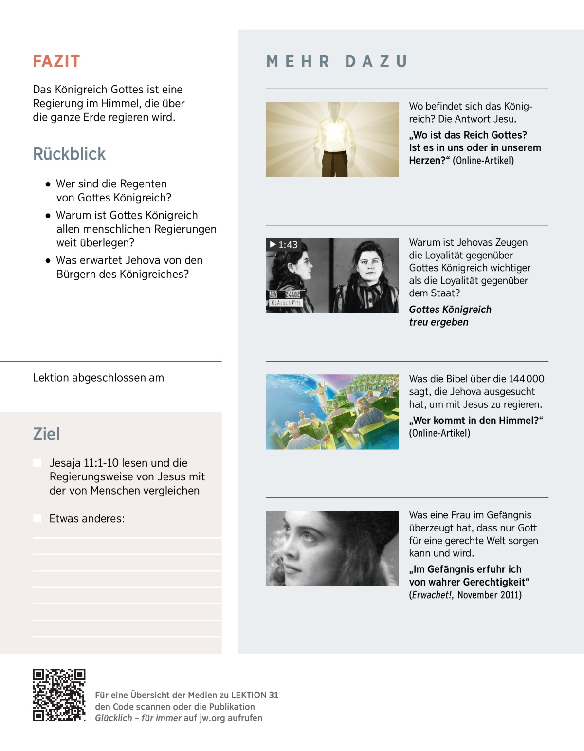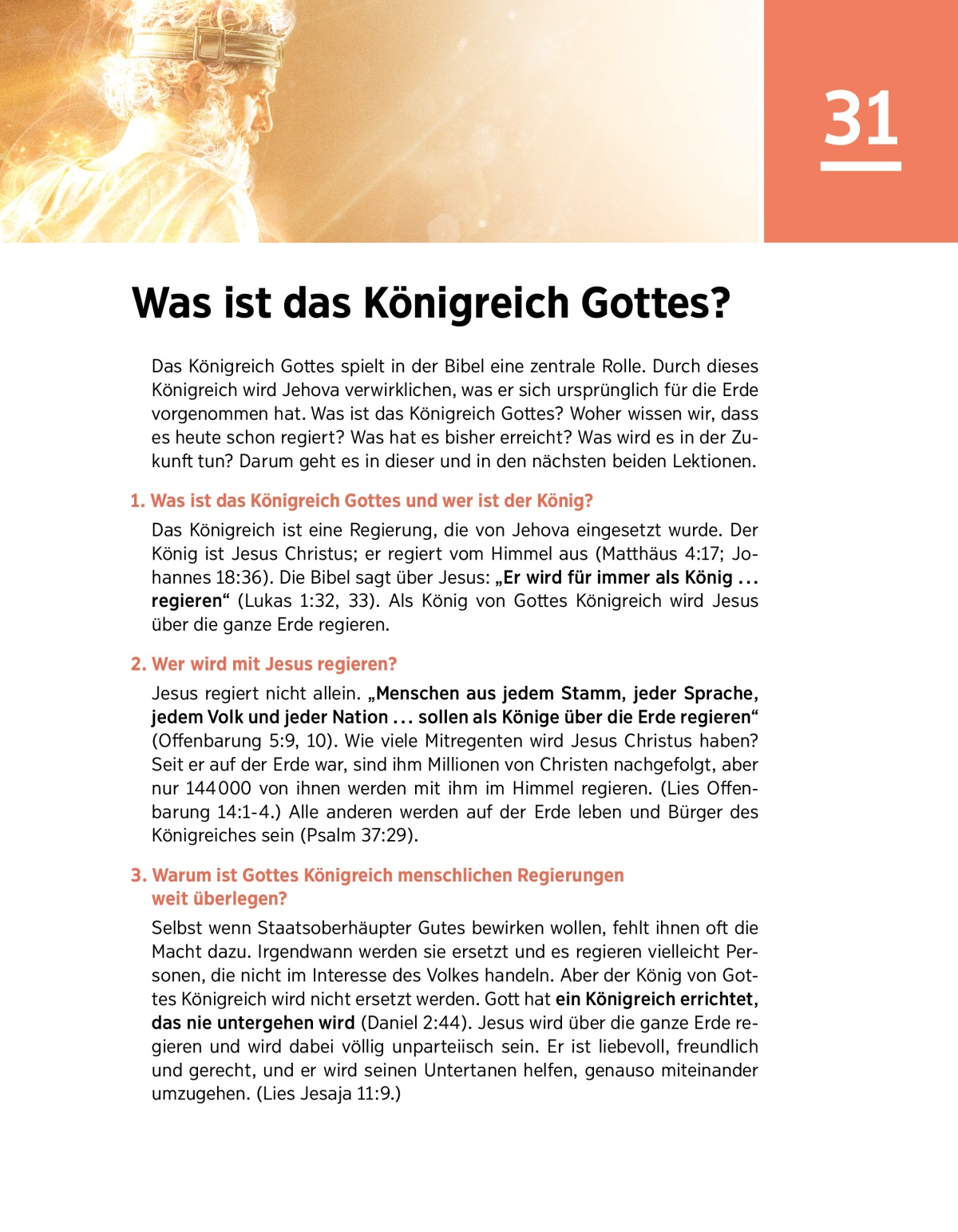 Das Königreich Gottes spielt in der Bibel eine zentrale Rolle. Durch dieses Königreich wird Jehova verwirklichen, was er sich ursprünglich für die Erde vorgenommen hat. Was ist das Königreich Gottes? Woher wissen wir, dass es heute schon regiert? Was hat es bisher erreicht? Was wird es in der Zukunft tun? Darum geht es in dieser und in den nächsten beiden Lektionen.