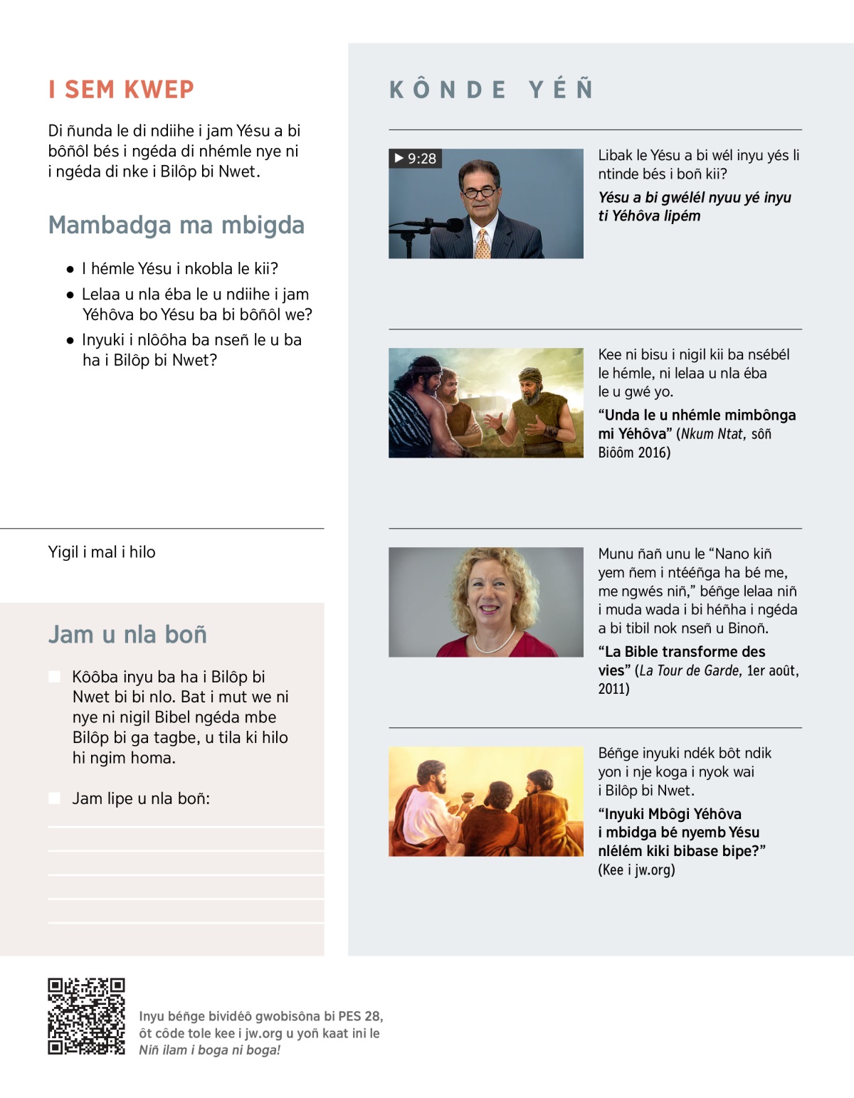 “Inyuki Mbôgi Yéhôva i mbidga bé nyemb Yésu nlélém kiki bibase bipe?” (Kee i jw.org)