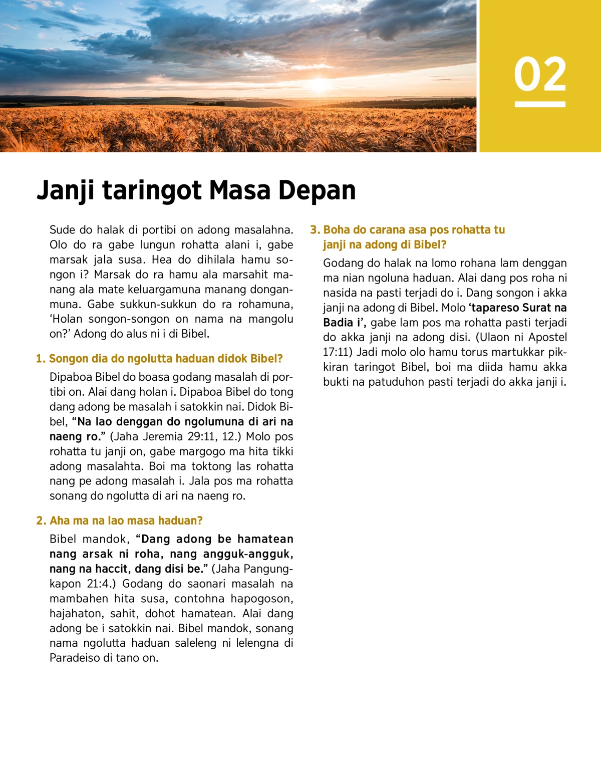 Dipaboa do di Bibel akka janji taringot masa depan. On boi mambahen las rohatta nang pe godang masalahta. Jala boi mambahen lam denggan ngolutta saonari.
