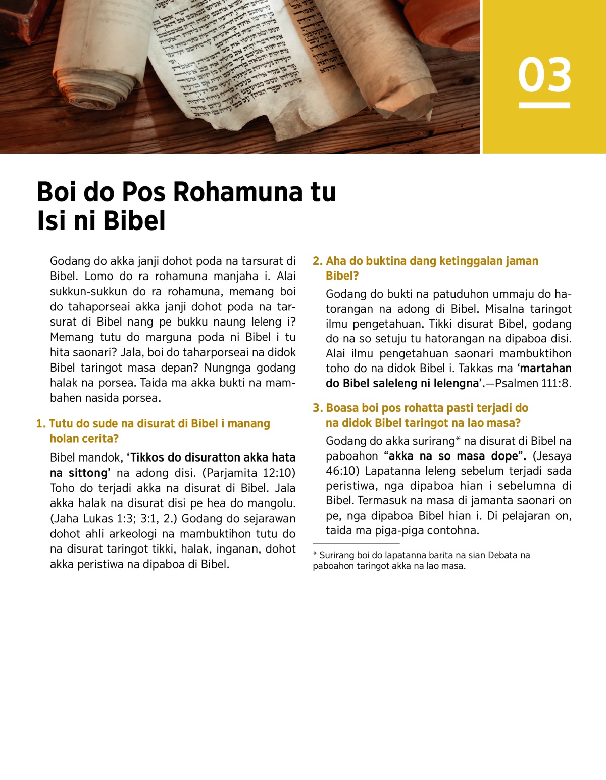 Godang do akka janji dohot poda na tarsurat di Bibel. Lomo do ra rohamuna manjaha i. Alai sukkun-sukkun do ra rohamuna, memang boi do tahaporseai akka janji dohot poda na tarsurat di Bibel nang pe bukku naung leleng i? Memang tutu do marguna poda ni Bibel i tu hita saonari? Jala, boi do taharporseai na didok Bibel taringot masa depan? Nungnga godang halak na porsea. Taida ma akka bukti na mambahen nasida porsea.