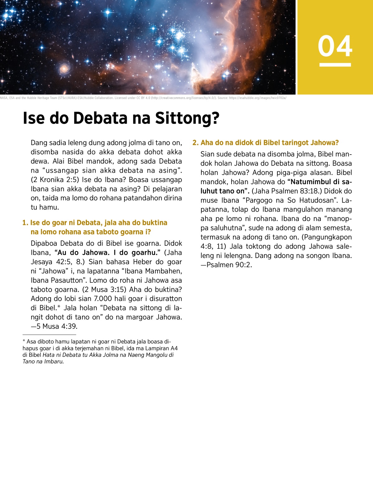 Dang sadia leleng dung adong jolma di tano on, disomba nasida do akka debata dohot akka dewa. Alai Bibel mandok, adong sada Debata na “ussangap sian akka debata na asing”. (2 Kronika 2:5) Ise do Ibana? Boasa ussangap Ibana sian akka debata na asing? Di pelajaran on, taida ma lomo do rohana patandahon dirina tu hamu.