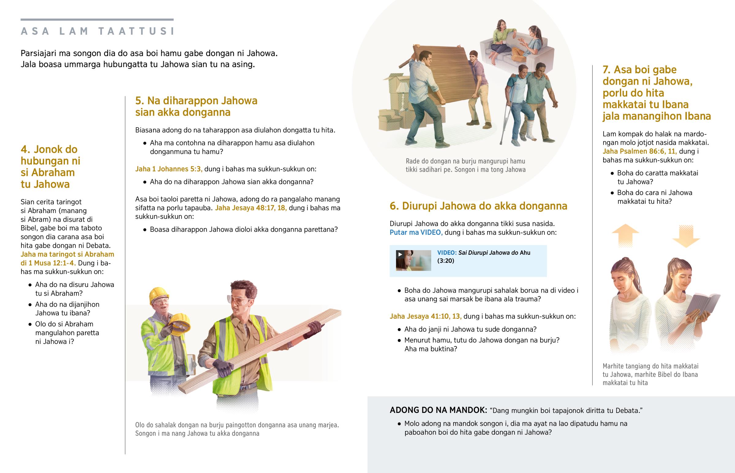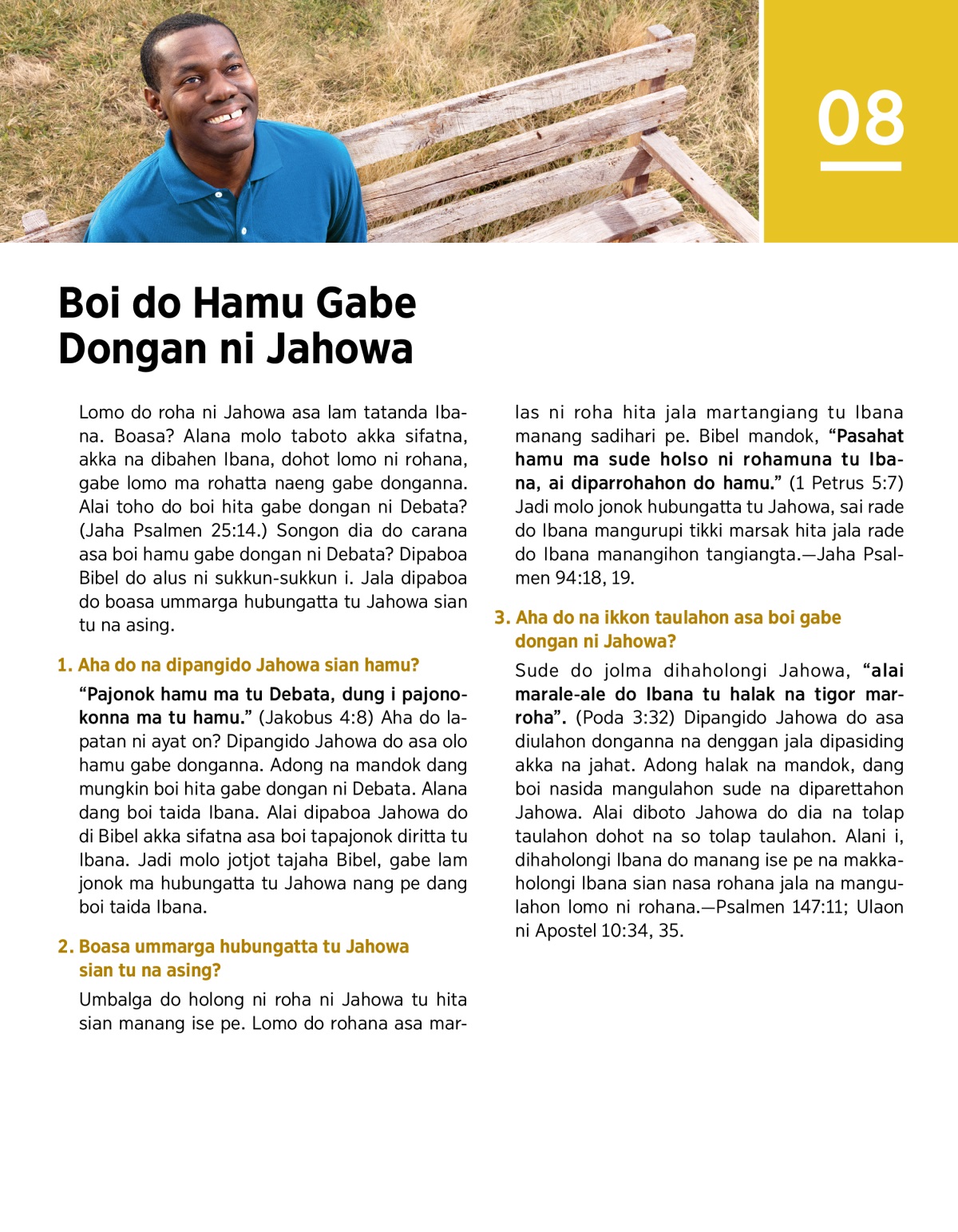 Parsiajari ma songon dia do asa boi hamu gabe dongan ni Jahowa. Jala boasa ummarga hubungatta tu Jahowa sian tu na asing.