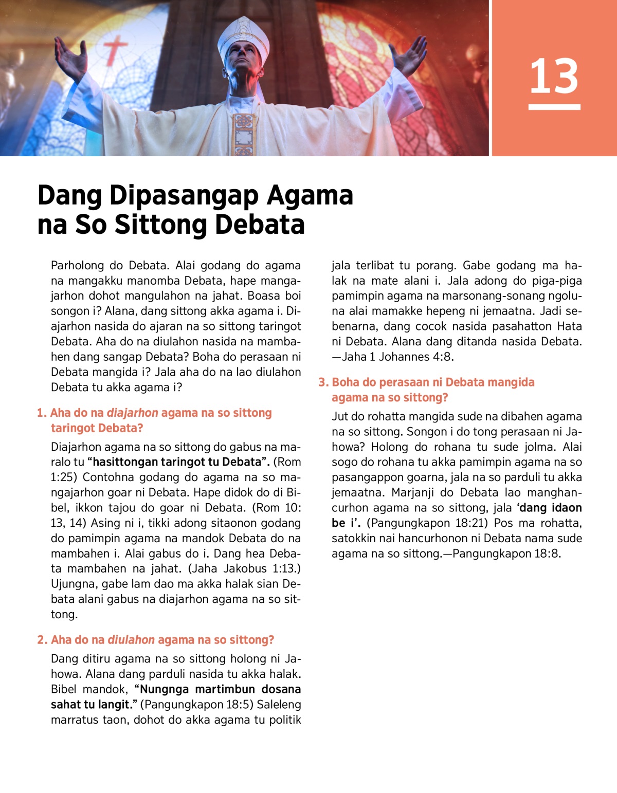 Dang dipasangap agama na so sittong Debata. Diajarhon nasida do ajaran na sala jala diulahon na jahat. Alai satokkin nai, hancurhonon ni Debata nama agama na so sittong.