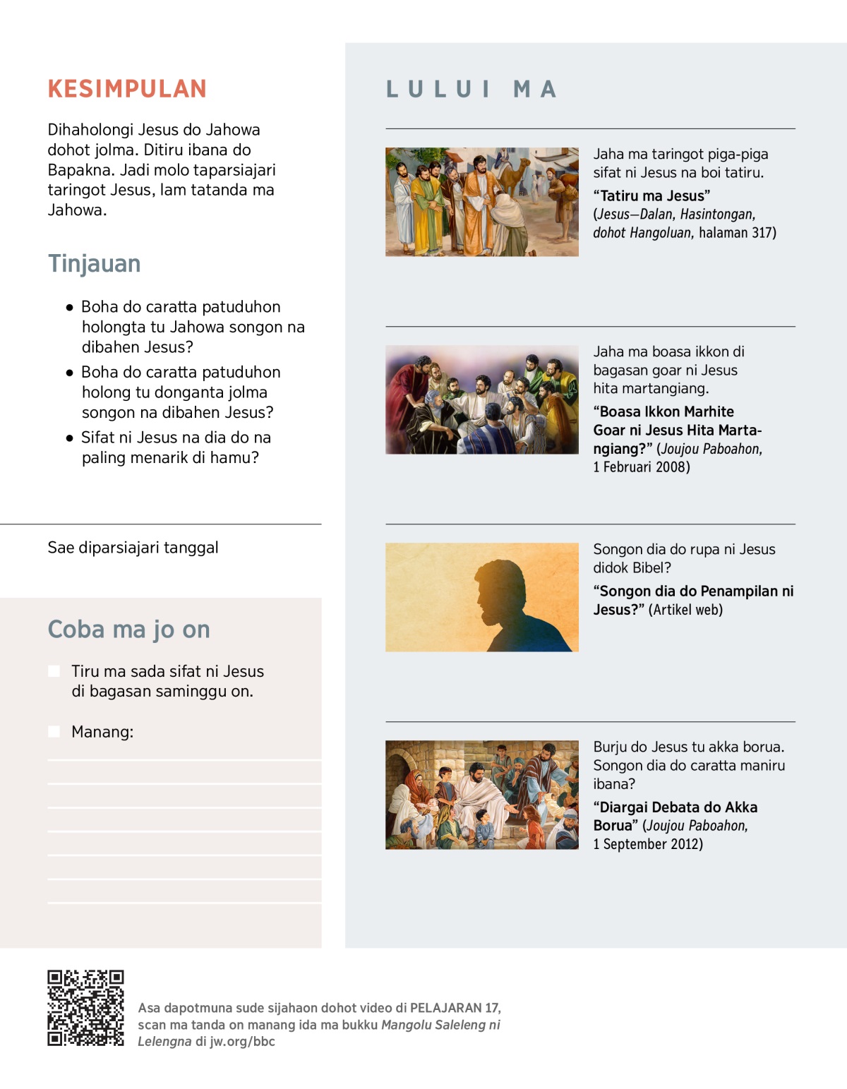 Dihaholongi Jesus do Jahowa dohot jolma. Ditiru ibana do Bapakna. Jadi molo taparsiajari taringot Jesus, lam tatanda ma Jahowa.