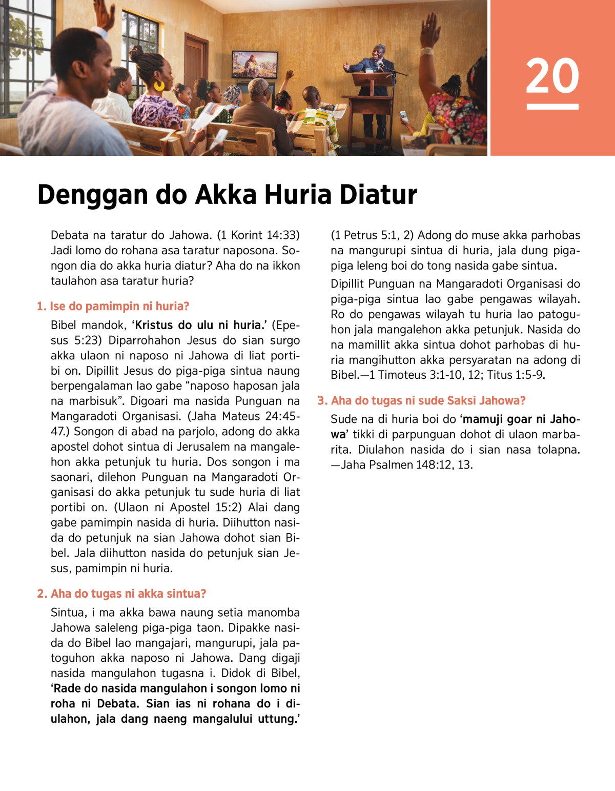 Bibel mandok, ‘Kristus do ulu ni huria.’ (Epesus 5:23) Diparrohahon Jesus do sian surgo akka ulaon ni naposo ni Jahowa di liat portibi on. Dipillit Jesus do piga-piga sintua naung berpengalaman lao gabe “naposo haposan jala na marbisuk”. Digoari ma nasida Punguan na Mangaradoti Organisasi. (Jaha Mateus 24:45-47.) Songon di abad na parjolo, adong do akka apostel dohot sintua di Jerusalem na mangalehon akka petunjuk tu huria. Dos songon i ma saonari, dilehon Punguan na Mangaradoti Organisasi do akka petunjuk tu sude huria di liat portibi on. (Ulaon ni Apostel 15:2) Alai dang gabe pamimpin nasida di huria. Diihutton nasida do petunjuk na sian Jahowa dohot sian Bibel. Jala diihutton nasida do petunjuk sian Jesus, pamimpin ni huria.