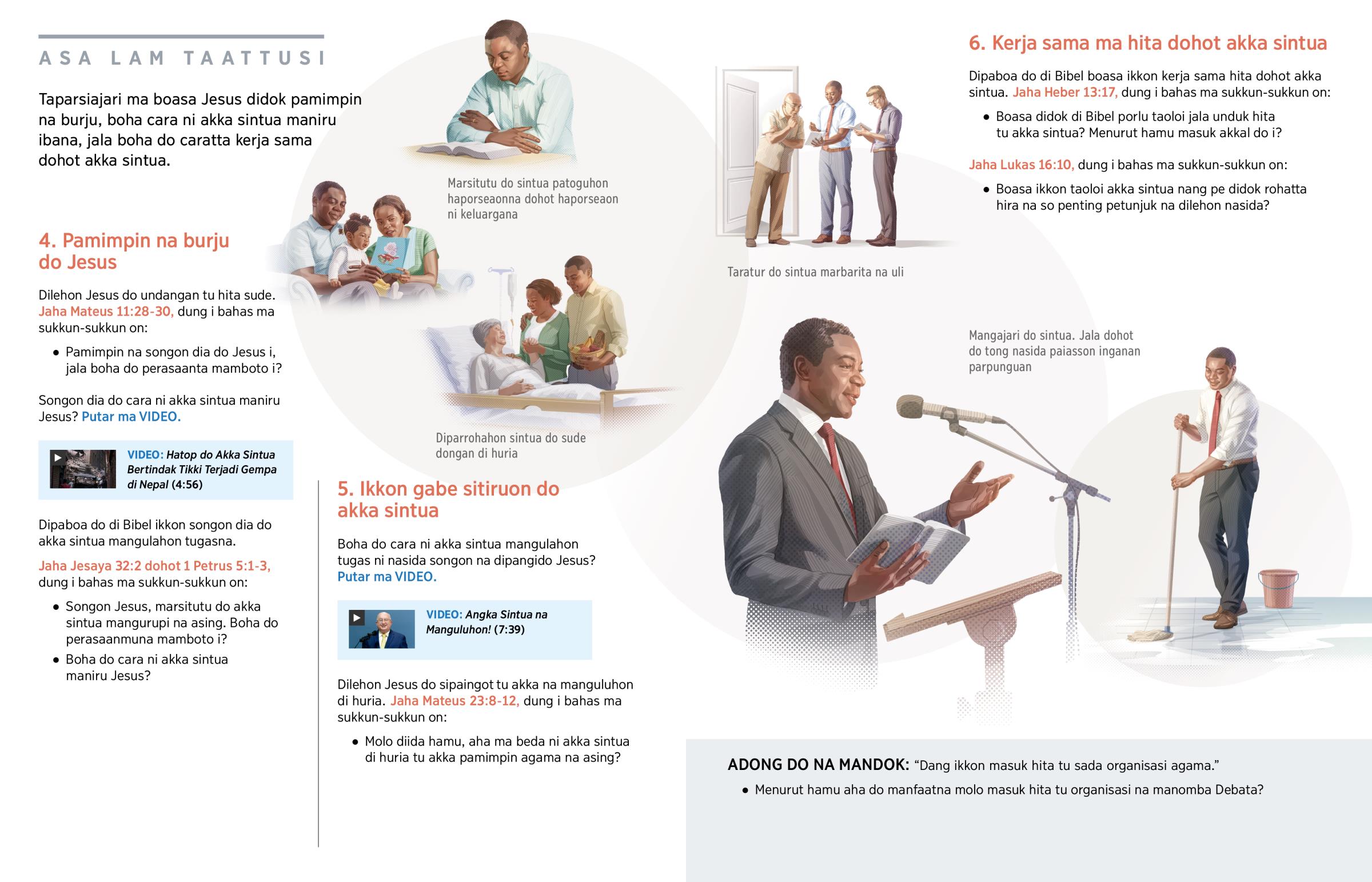 Jesus do pamimpin ni huria. Ditiru akka sintua do Jesus, diajari jala dipatogu do hita. Alani i las ma rohatta kerja sama dohot nasida.