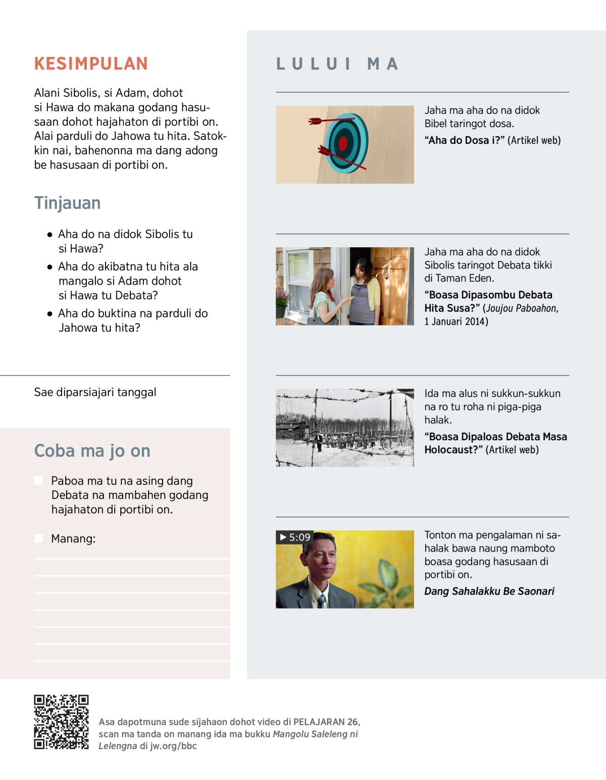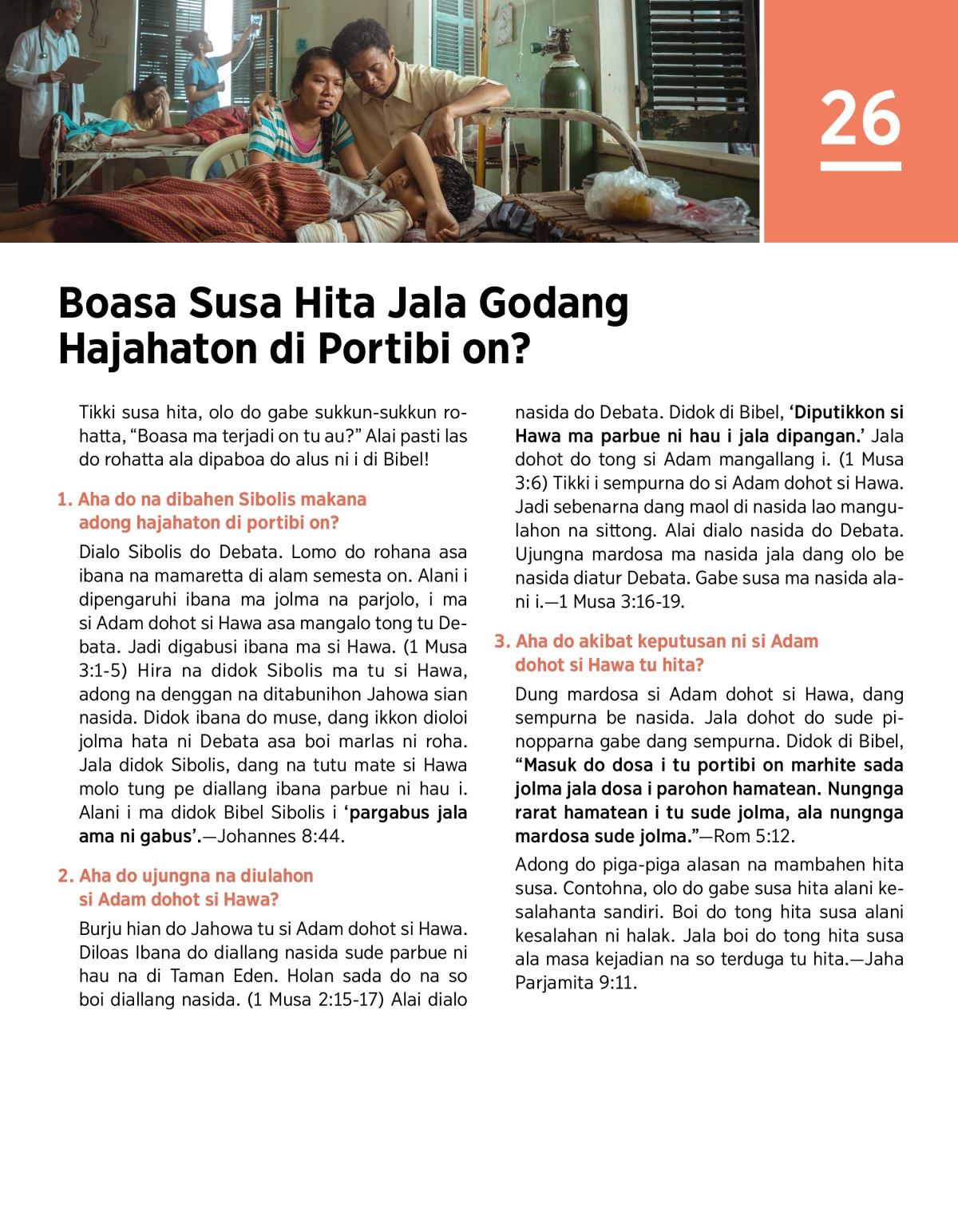 Alani Sibolis, si Adam, dohot si Hawa do makana godang hasusaan dohot hajahaton di portibi on. Alai parduli do Jahowa tu hita. Satokkin nai, bahenonna ma dang adong be hasusaan di portibi on.