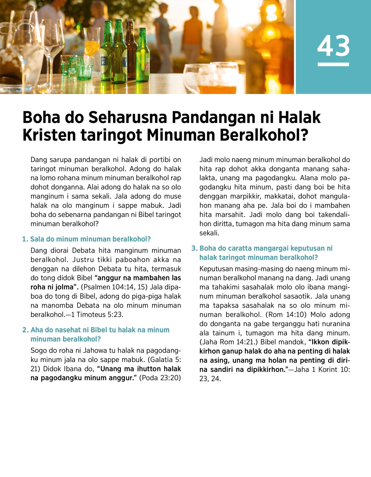 Taida ma songon dia prinsip ni Bibel boi mangurupi hamu mambahen keputusan naeng minum manang na dang, jala sadia godang naeng diinum hamu. Jala boha do carana pasohon kecanduan minuman beralkohol.