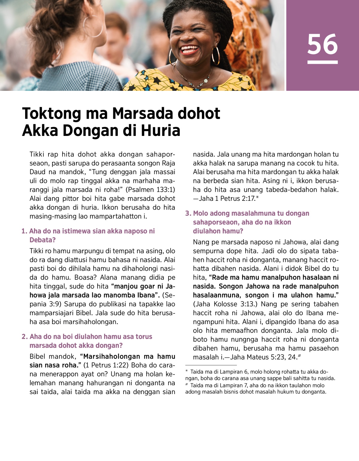 Bibel mandok, “Marsihaholongan ma hamu sian nasa roha.” (1 Petrus 1:22) Boha do carana menerappon ayat on? Unang ma holan kelemahan manang hahurangan ni donganta na sai taida, alai taida ma akka na denggan sian nasida. Jala unang ma hita mardongan holan tu akka halak na sarupa manang na cocok tu hita. Alai berusaha ma hita mardongan tu akka halak na berbeda sian hita. Asing ni i, ikkon berusaha do hita asa unang tabeda-bedahon halak.—Jaha 1 Petrus 2:17.a