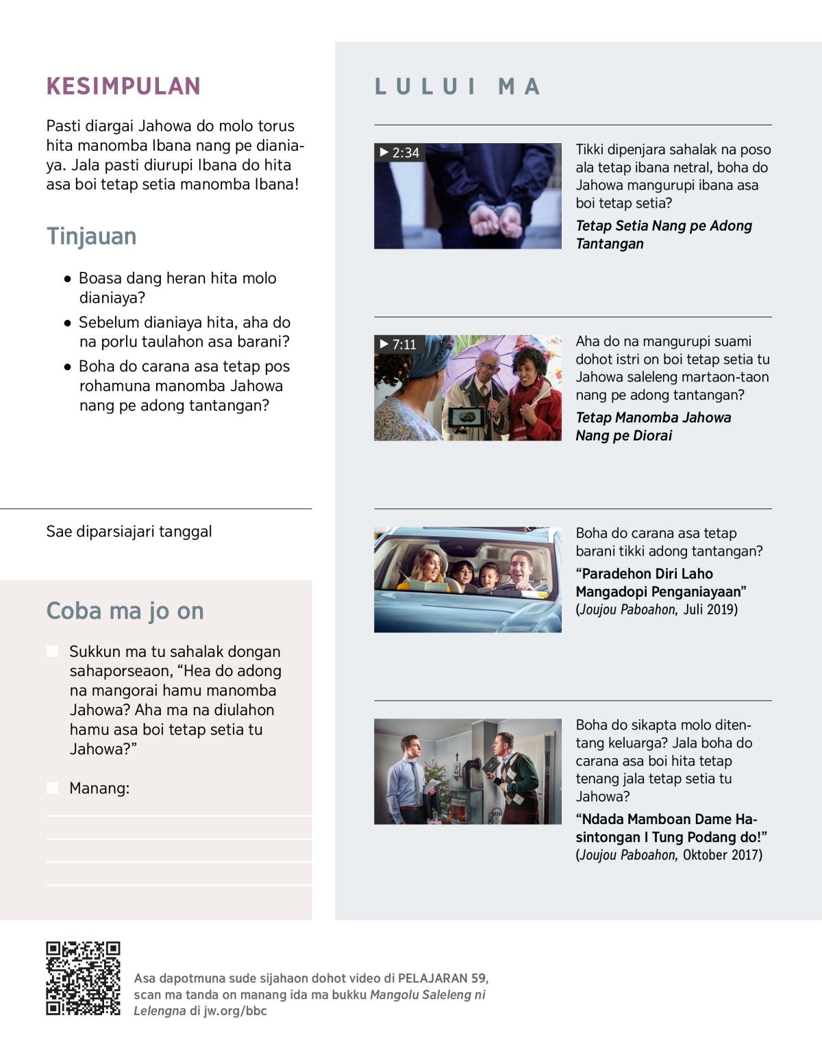Pasti diargai Jahowa do molo torus hita manomba Ibana nang pe dianiaya. Jala pasti diurupi Ibana do hita asa boi tetap setia manomba Ibana!