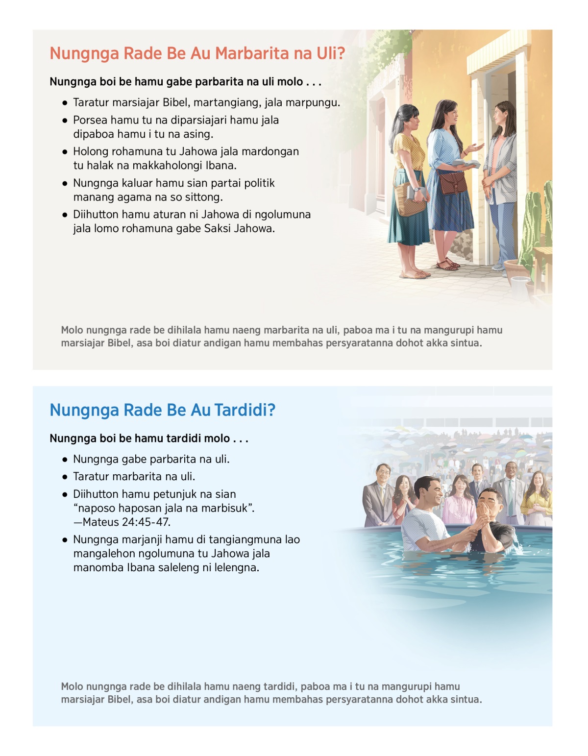 Molo nungnga rade be dihilala hamu naeng marbarita na uli, paboa ma i tu na mangurupi hamu marsiajar Bibel, asa boi diatur andigan hamu membahas persyaratanna dohot akka sintua.