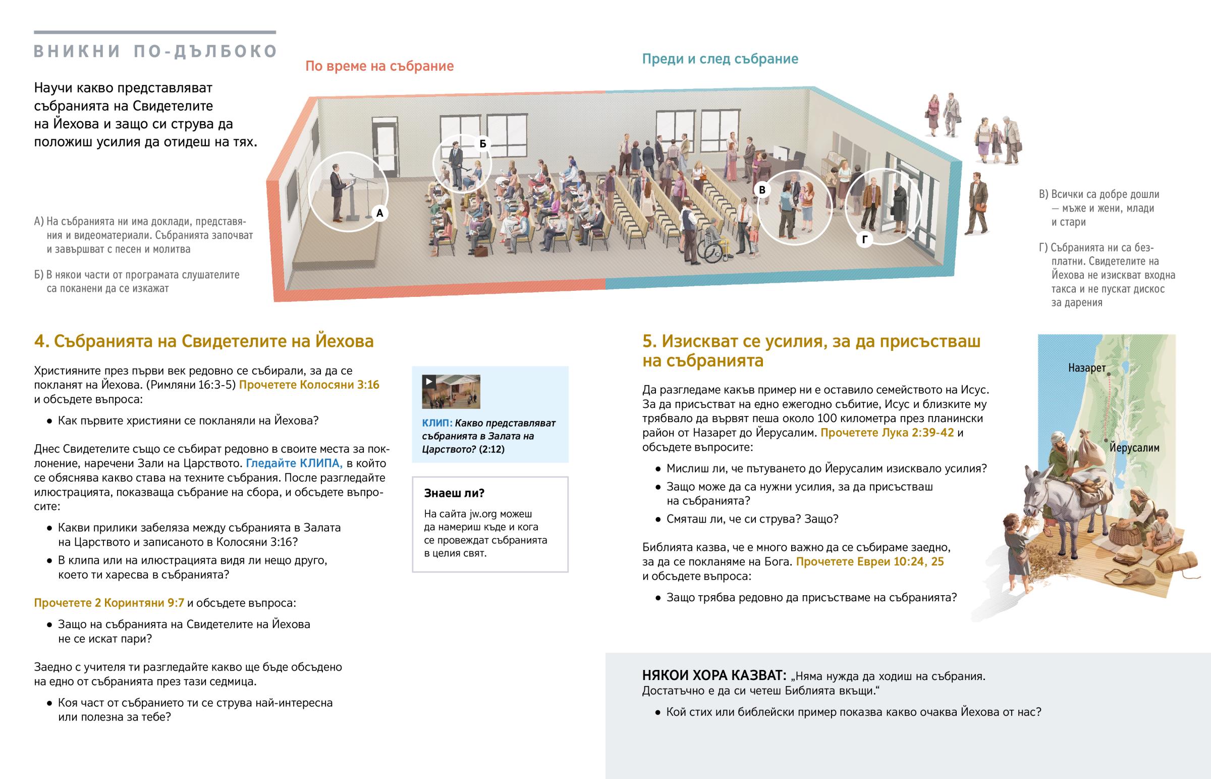 Днес Свидетелите също се събират редовно в своите места за поклонение, наречени Зали на Царството. Гледайте КЛИПА, в който се обяснява какво става на техните събрания. После разгледайте илюстрацията, показваща събрание на сбора, и обсъдете въпросите: