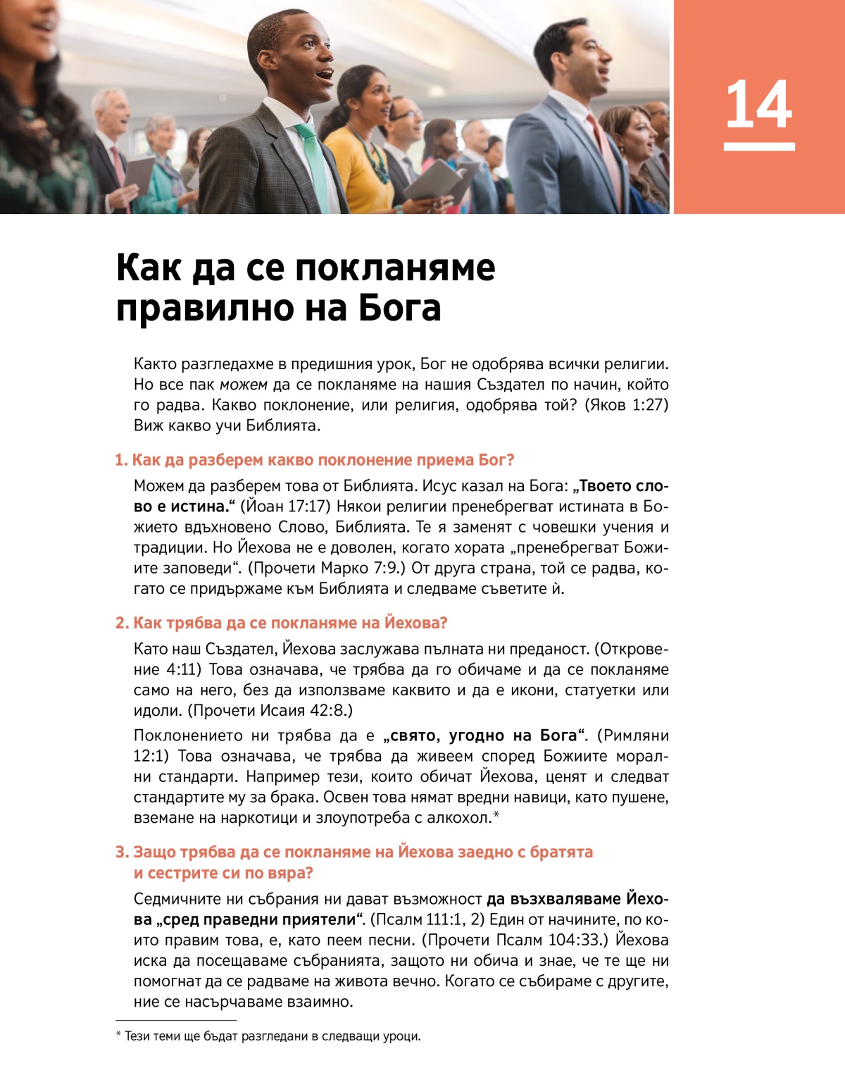 Както разгледахме в предишния урок, Бог не одобрява всички религии. Но все пак можем да се покланяме на нашия Създател по начин, който го радва. Какво поклонение, или религия, одобрява той? (Яков 1:27) Виж какво учи Библията.