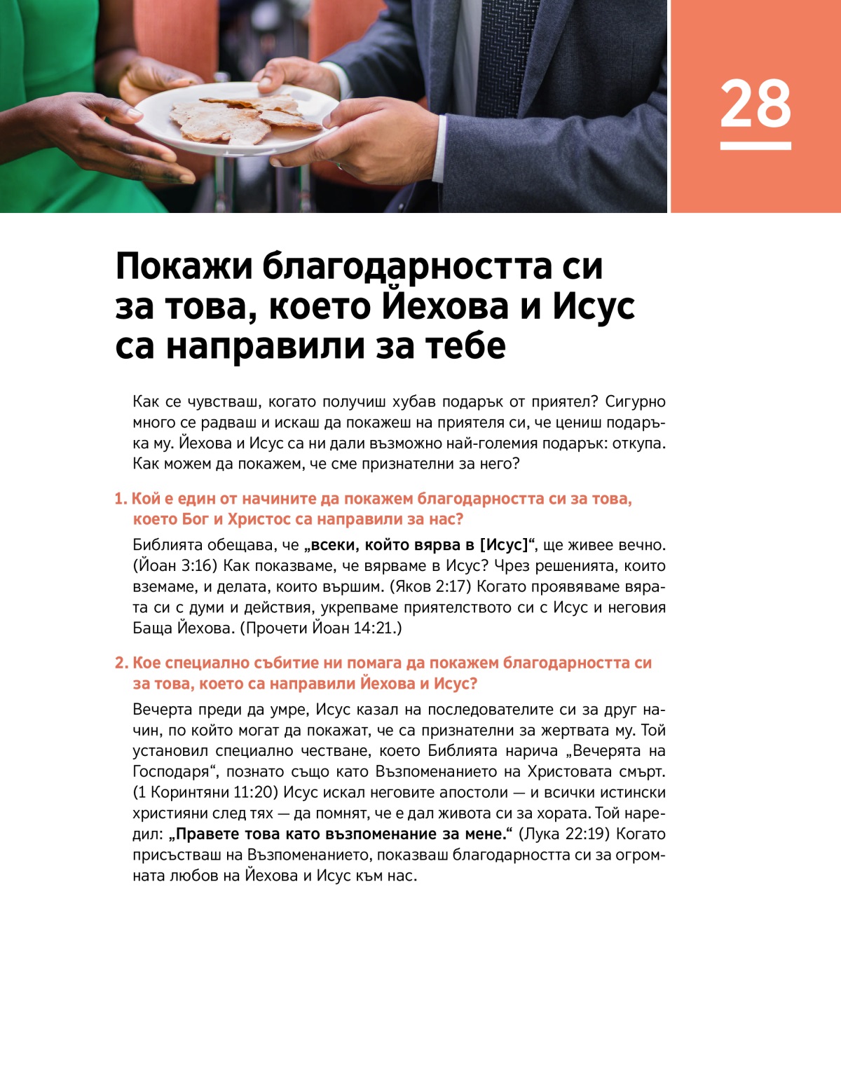 Исус искал неговите ученици да честват Вечерята на Господаря веднъж в годината на годишнината от смъртта му. Затова Свидетелите на Йехова се събират всяка година, за да си спомнят за смъртта на Христос по начина, по който той наредил. Гледайте КЛИПА, в който се обяснява за това важно събитие. После обсъдете въпроса: