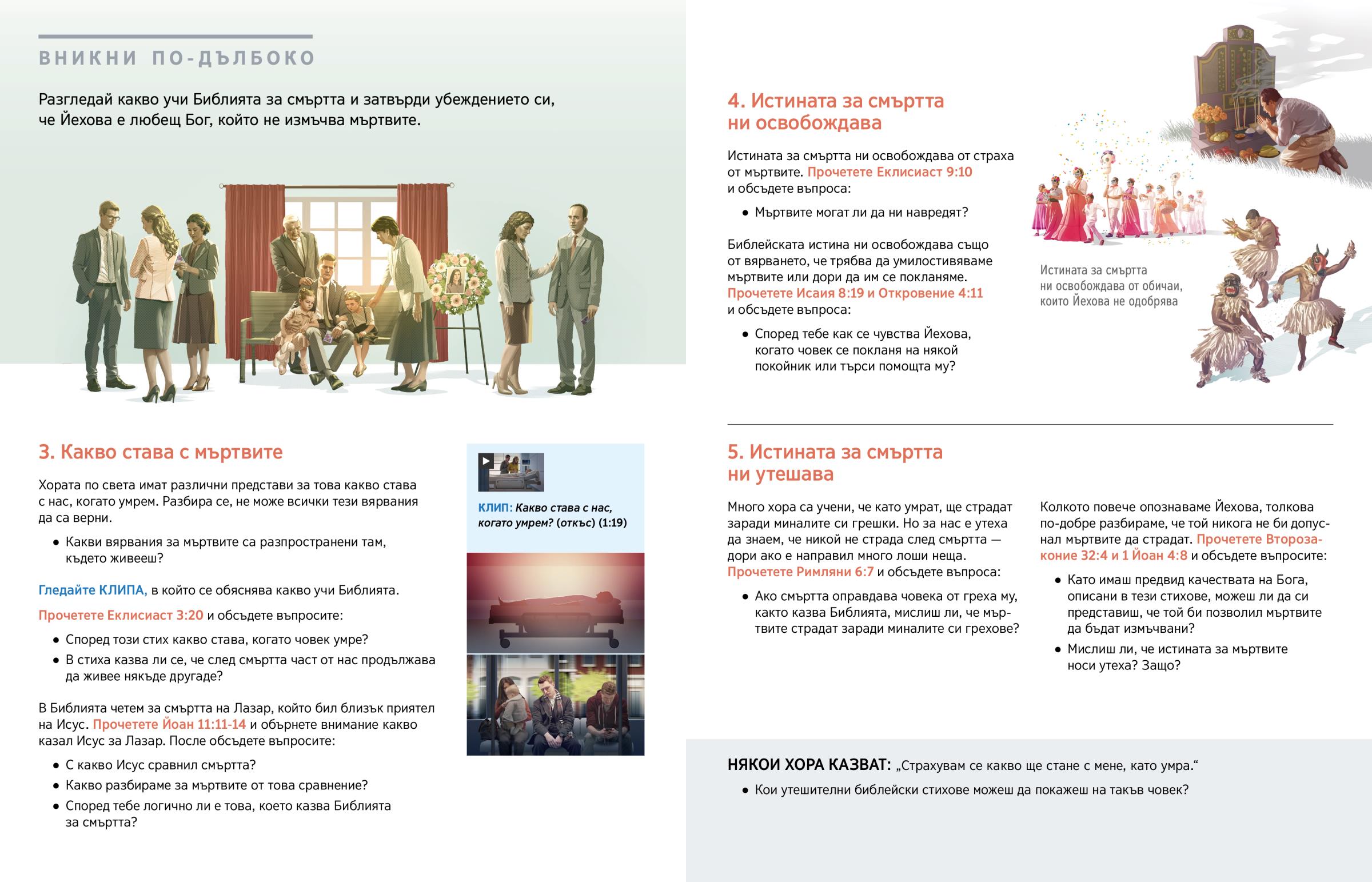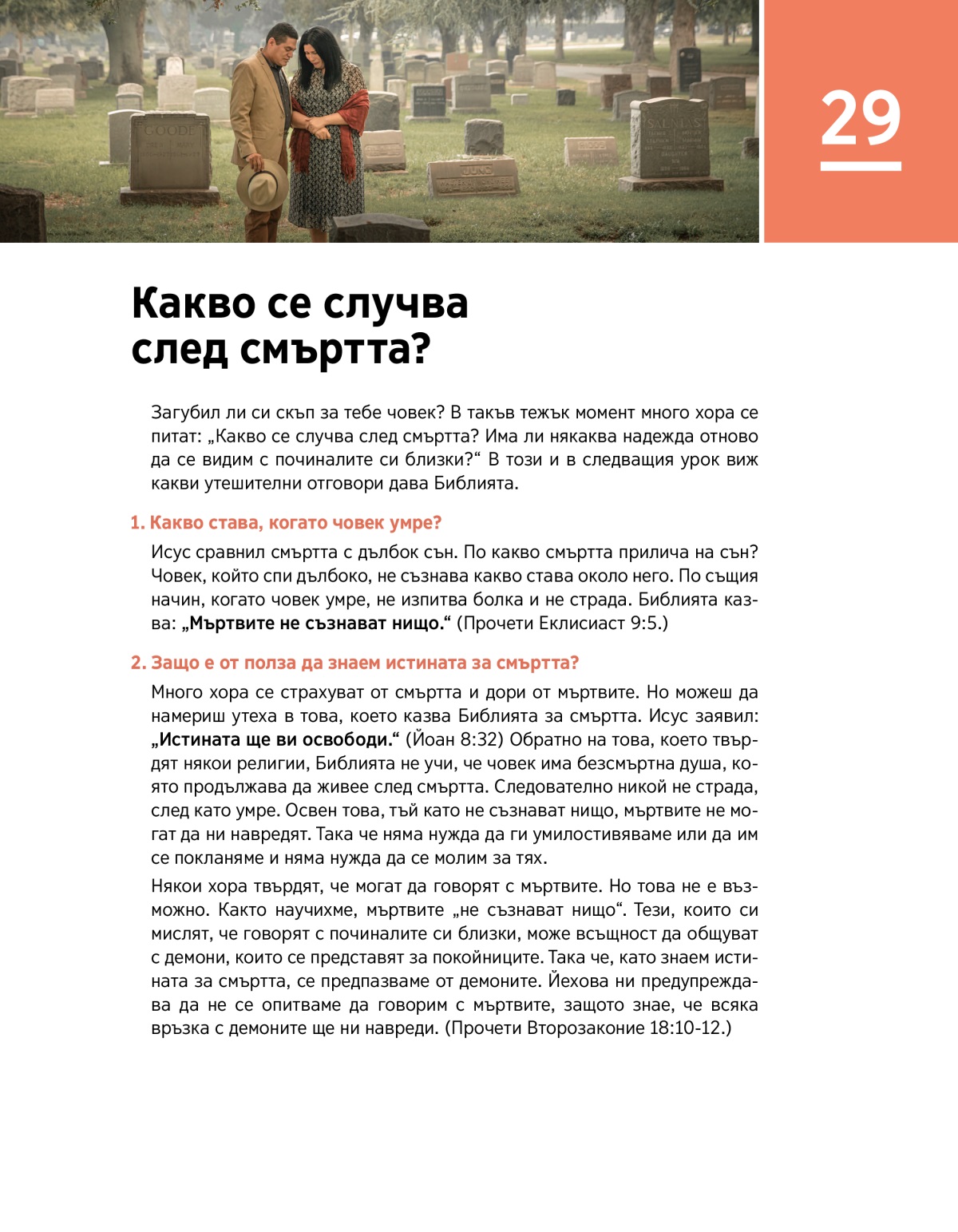 Загубил ли си скъп за тебе човек? В такъв тежък момент много хора се питат: „Какво се случва след смъртта? Има ли някаква надежда отново да се видим с починалите си близки?“ В този и в следващия урок виж какви утешителни отговори дава Библията.