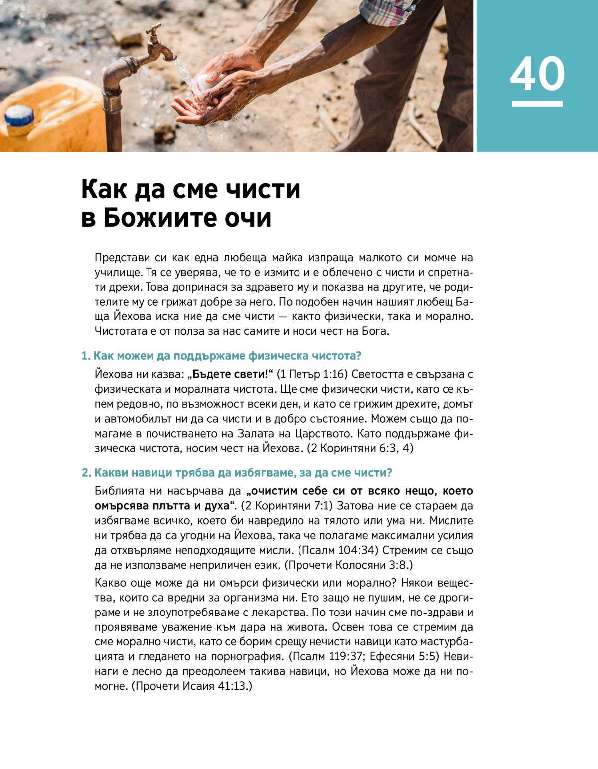 Представи си как една любеща майка изпраща малкото си момче на училище. Тя се уверява, че то е измито и е облечено с чисти и спретнати дрехи. Това допринася за здравето му и показва на другите, че родителите му се грижат добре за него. По подобен начин нашият любещ Баща Йехова иска ние да сме чисти — както физически, така и морално. Чистотата е от полза за нас самите и носи чест на Бога.