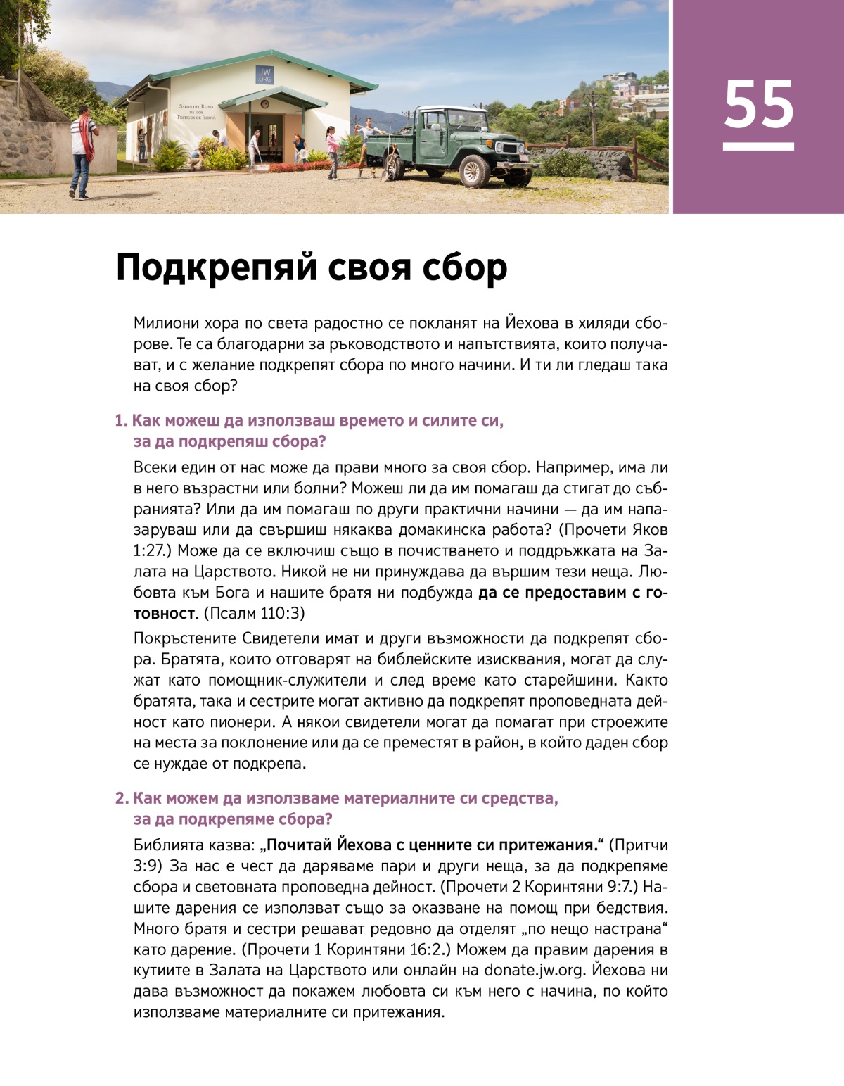 Всеки един от нас може да прави много за своя сбор. Например, има ли в него възрастни или болни? Можеш ли да им помагаш да стигат до събранията? Или да им помагаш по други практични начини — да им напазаруваш или да свършиш някаква домакинска работа? (Прочети Яков 1:27.) Може да се включиш също в почистването и поддръжката на Залата на Царството. Никой не ни принуждава да вършим тези неща. Любовта към Бога и нашите братя ни подбужда да се предоставим с готовност. (Псалм 110:3)