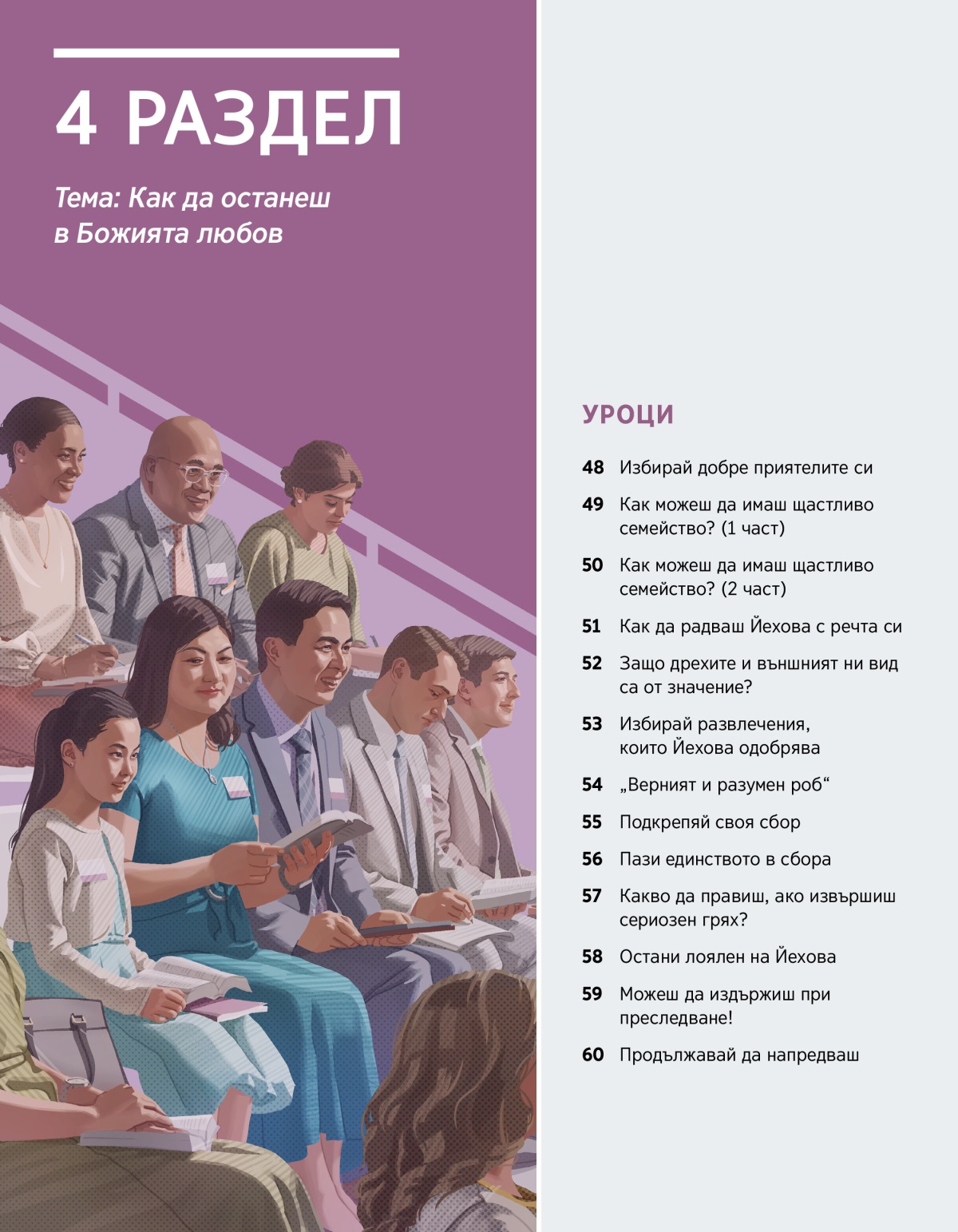 4 раздел Печатно издание Тема: Как да останеш в Божията любов УРОЦИ 48 Избирай добре приятелите си 49 Как можеш да имаш щастливо семейство? (1 част) 50 Как можеш да имаш щастливо семейство? (2 част) 51 Как да радваш Йехова с речта си 52 Защо дрехите и външният ни вид са от значение? 53 Избирай развлечения, които Йехова одобрява 54 „Верният и разумен роб“ 55 Подкрепяй своя сбор 56 Пази единството в сбора 57 Какво да правиш, ако извършиш сериозен грях? 58 Остани лоялен на Йехова 59 Можеш да издържиш при преследване! 60 Продължавай да напредваш