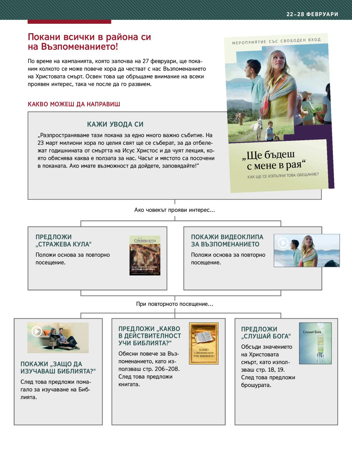 По време на кампанията, която започва на 27 февруари, ще поканим колкото се може повече хора да честват с нас Възпоменанието на Христовата смърт. Освен това ще обръщаме внимание на всеки проявен интерес, така че после да го развием.