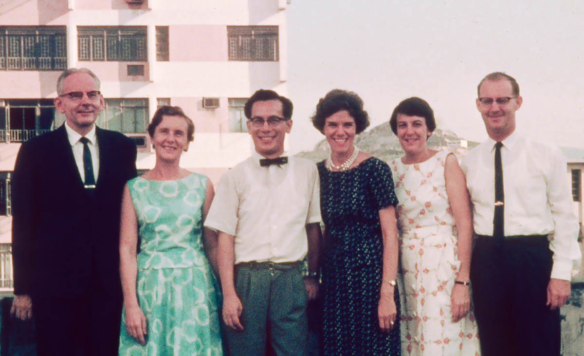 Шестимата членове на бетеловото семейство в Хонконг в средата на 60-те години. Ние с Фу-лон сме в средата