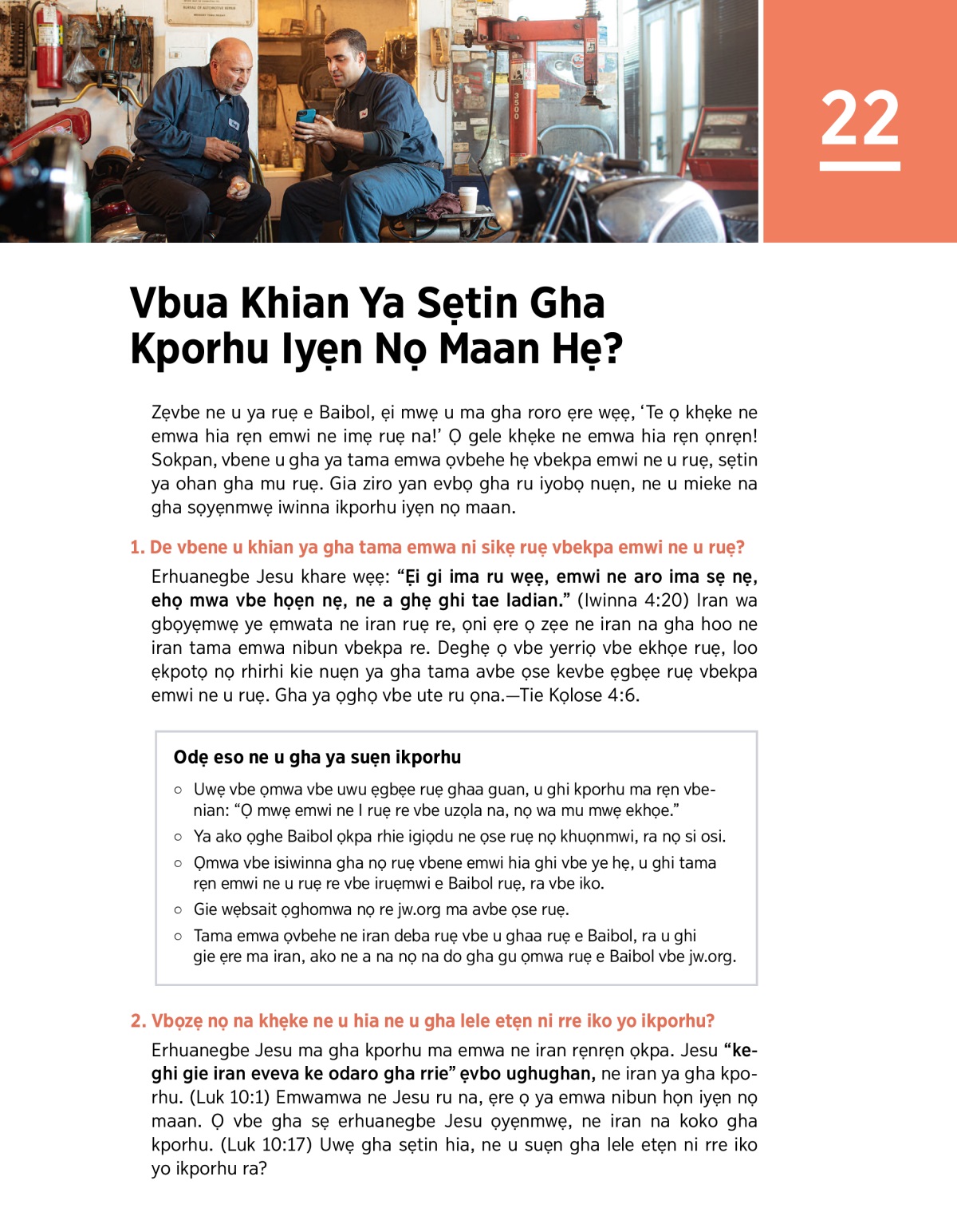 Zẹvbe ne u ya ruẹ e Baibol, ẹi mwẹ u ma gha roro ẹre wẹẹ, ‘Te ọ khẹke ne emwa hia rẹn emwi ne imẹ ruẹ na!’ Ọ gele khẹke ne emwa hia rẹn ọnrẹn! Sokpan, vbene u gha ya tama emwa ọvbehe hẹ vbekpa emwi ne u ruẹ, sẹtin ya ohan gha mu ruẹ. Gia ziro yan evbọ gha ru iyobọ nuẹn, ne u mieke na gha sọyẹnmwẹ iwinna ikporhu iyẹn nọ maan.