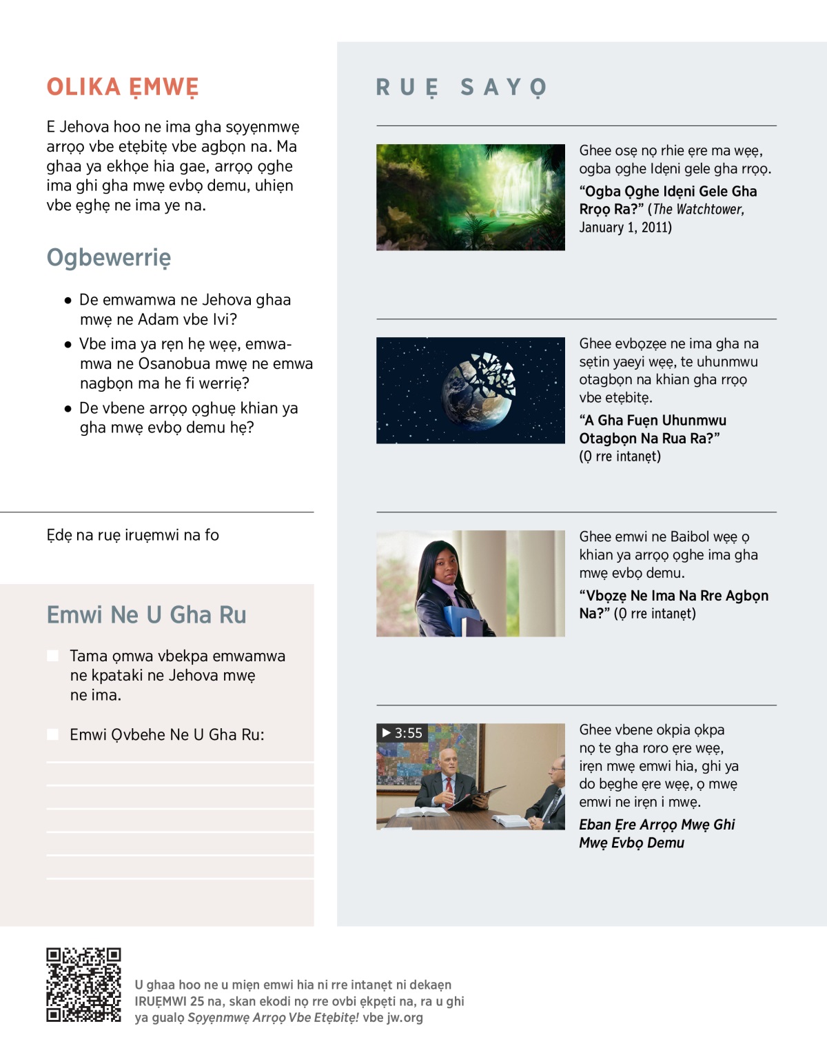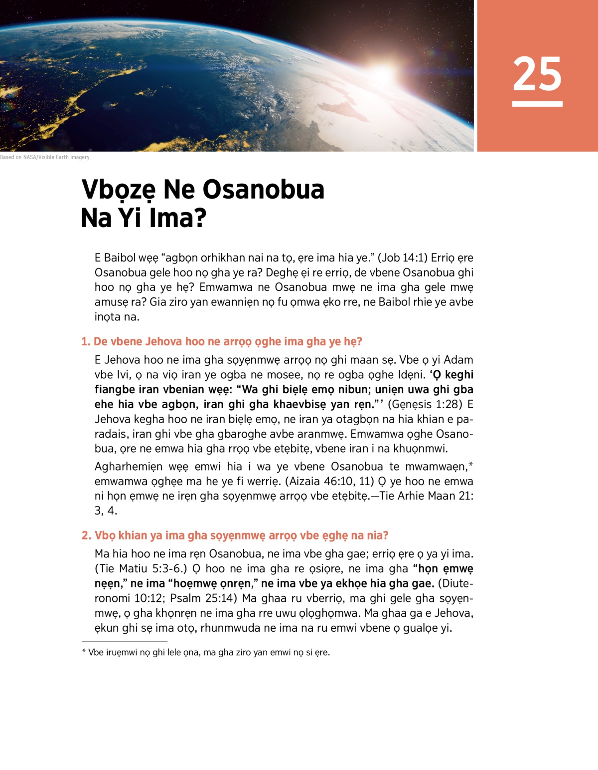 E Baibol wẹẹ “agbọn orhikhan nai na tọ, ẹre ima hia ye.” (Job 14:1) Erriọ ẹre Osanobua gele hoo nọ gha ye ra? Deghẹ ẹi re erriọ, de vbene Osanobua ghi hoo nọ gha ye hẹ? Emwamwa ne Osanobua mwẹ ne ima gha gele mwẹ amusẹ ra? Gia ziro yan ewanniẹn nọ fu ọmwa ẹko rre, ne Baibol rhie ye avbe inọta na.