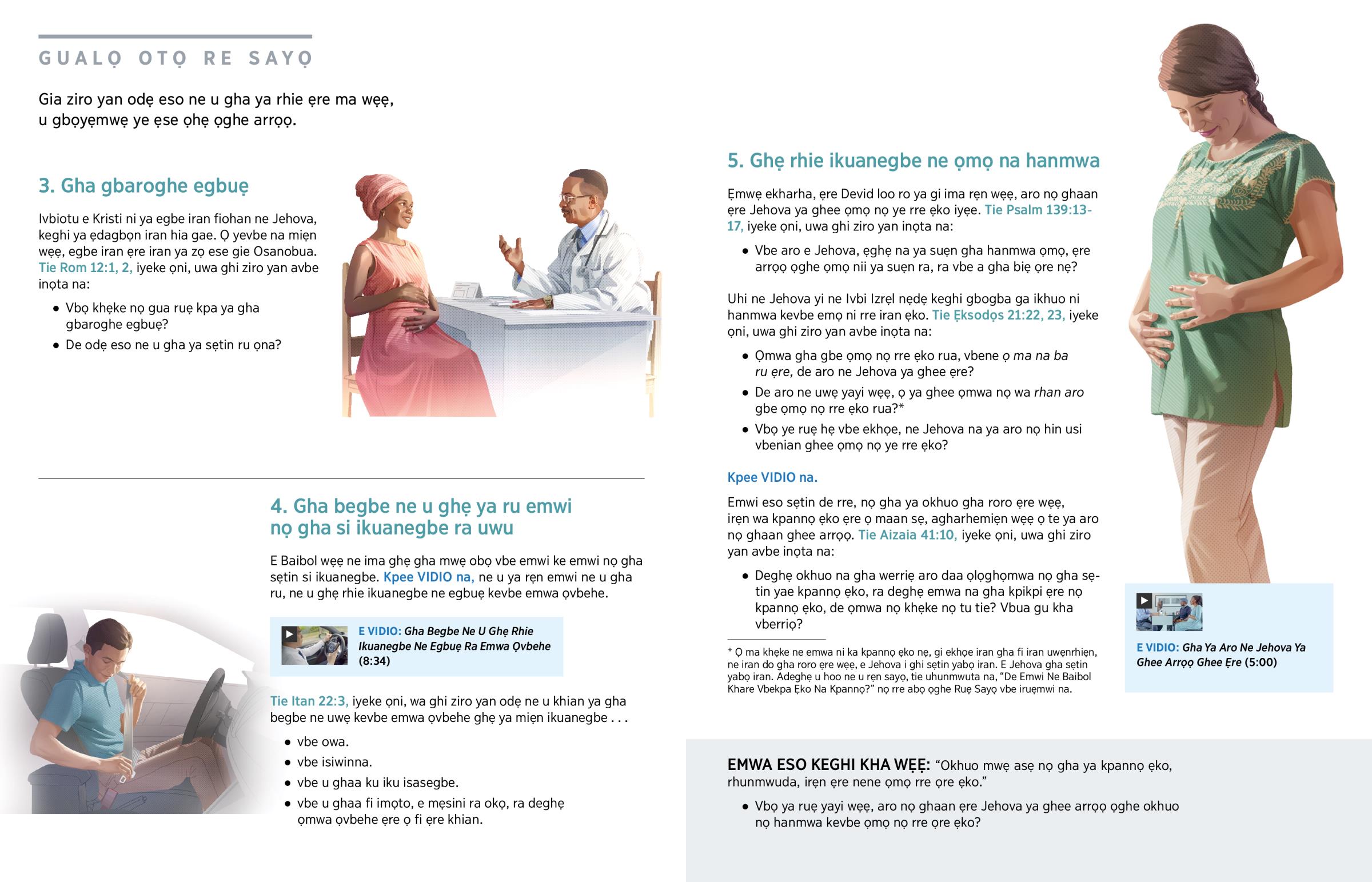 Ke ẹghẹ na ya suẹn gha hanmwa ruẹ gha dee, ẹre Jehova ke gbaroghe ruẹ. Orhiọn nọhuanrẹn keghi dia e Devid ne ọguọmwadia Osanobua ya kha wẹẹ: “[Osanobua] bẹghe mwẹ nẹ, a ke biẹ mwẹ.” (Psalm 139:16) Arrọọ ruẹ wa hin usi vbe odaro e Jehova. (Tie Matiu 10:29-31.) Ọ keghi wa kakabọ da e Jehova, vbe ọmwa gha wa rhan aro gbe ọmwa rua, ra vbe ọmwa gha gbe egbe ẹre rua.a (Ẹksodọs 20:13) Ọ keghi vbe da e Jehova vbe ima gha gheghe mu arrọọ ọghe ima ye ikpadede, ra deghẹ ima ma ru emwi nọ khẹke, ne ima ya gbogba ga arrọọ ọghe emwa ọvbehe. Ma ghaa gbaroghe egbe ima, ma na vbe gha ya aro nọ ghaan ghee arrọọ ọghe emwa ọvbehe, te ima rhie ẹre ma wẹẹ, ma gbọyẹmwẹ ye ẹse ọhẹ nọ hin usi ọghe arrọọ.