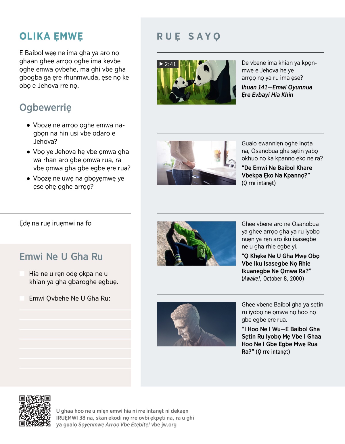 a E Jehova wa mwẹ ẹnina daa emwa ne iro han rẹn. (Psalm 34:18) Ọ rẹnrẹn wẹẹ, emwi eso sẹtin sunu nọ gha da emwa eso sẹrriọ wẹẹ, iran ghi gha hoo ne iran gbe egbe iran rua. Ọ wa mu egbe nọ ya ru iyobọ ne emwa vbenian. Ne u ya rẹn vbene ọ ya ru iyobọ ne emwa vbenian hẹ, tie uhunmwuta na, “I Hoo Ne I Wu—E Baibol Gha Sẹtin Ru Iyobọ Mẹ Vbe I Ghaa Hoo Ne I Gbe Egbe Mwẹ Rua Ra?” nọ rre abọ ọghe Ruẹ Sayọ vbe iruẹmwi na.