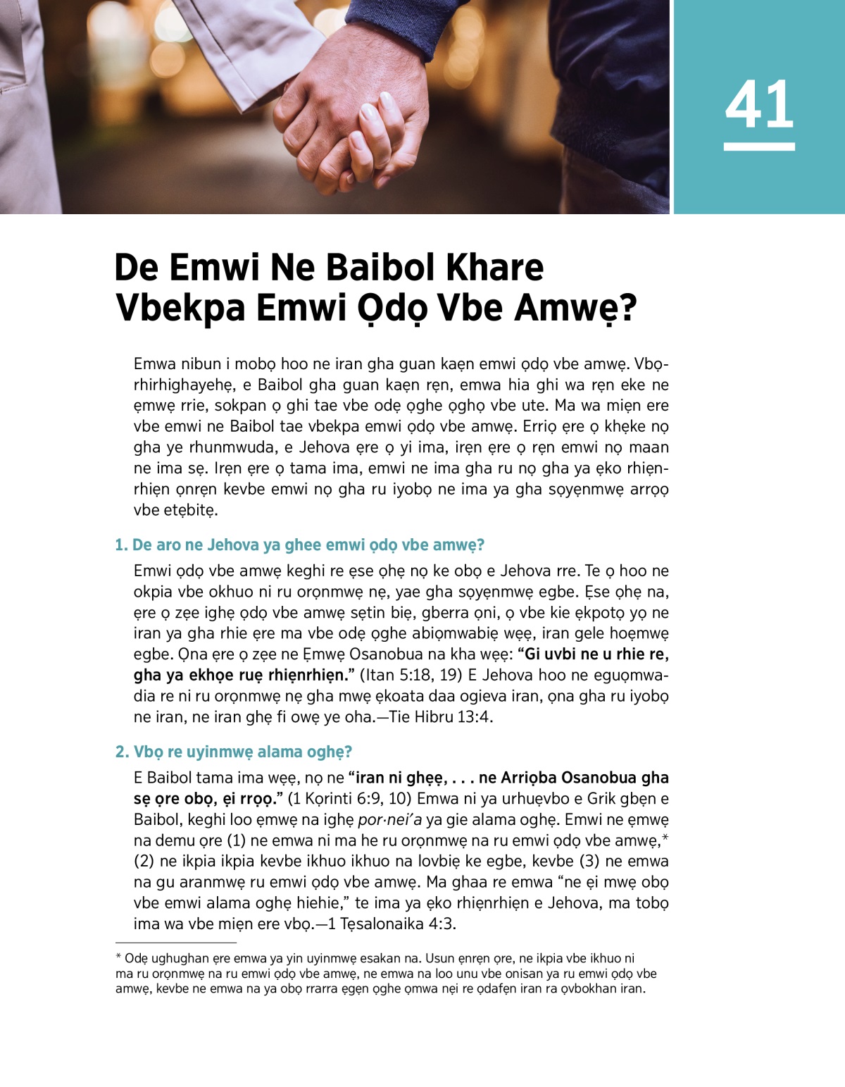Emwi ọdọ vbe amwẹ keghi re ẹse ọhẹ nọ ke obọ e Jehova rre. Te ọ hoo ne okpia vbe okhuo ni ru orọnmwẹ nẹ, yae gha sọyẹnmwẹ egbe. Ẹse ọhẹ na, ẹre ọ zẹe ighẹ ọdọ vbe amwẹ sẹtin biẹ, gberra ọni, ọ vbe kie ẹkpotọ yọ ne iran ya gha rhie ẹre ma vbe odẹ ọghe abiọmwabiẹ wẹẹ, iran gele hoẹmwẹ egbe. Ọna ẹre ọ zẹe ne Ẹmwẹ Osanobua na kha wẹẹ: “Gi uvbi ne u rhie re, gha ya ekhọe ruẹ rhiẹnrhiẹn.” (Itan 5:18, 19) E Jehova hoo ne eguọmwadia re ni ru orọnmwẹ nẹ gha mwẹ ẹkoata daa ogieva iran, ọna gha ru iyobọ ne iran, ne iran ghẹ fi owẹ ye oha.—Tie Hibru 13:4.