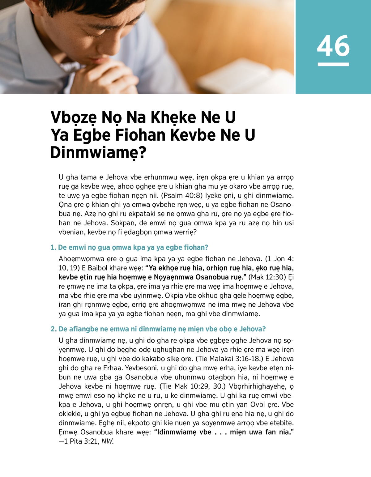 U gha tama e Jehova vbe erhunmwu wẹẹ, irẹn ọkpa ẹre u khian ya arrọọ ruẹ ga kevbe wẹẹ, ahoo ọghẹe ẹre u khian gha mu ye okaro vbe arrọọ ruẹ, te uwẹ ya egbe fiohan nẹẹn nii. (Psalm 40:8) Iyeke ọni, u ghi dinmwiamẹ. Ọna ẹre ọ khian ghi ya emwa ọvbehe rẹn wẹẹ, u ya egbe fiohan ne Osanobua nẹ. Azẹ nọ ghi ru ekpataki sẹ ne ọmwa gha ru, ọre nọ ya egbe ẹre fiohan ne Jehova. Sokpan, de emwi nọ gua ọmwa kpa ya ru azẹ nọ hin usi vbenian, kevbe nọ fi ẹdagbọn ọmwa werriẹ?