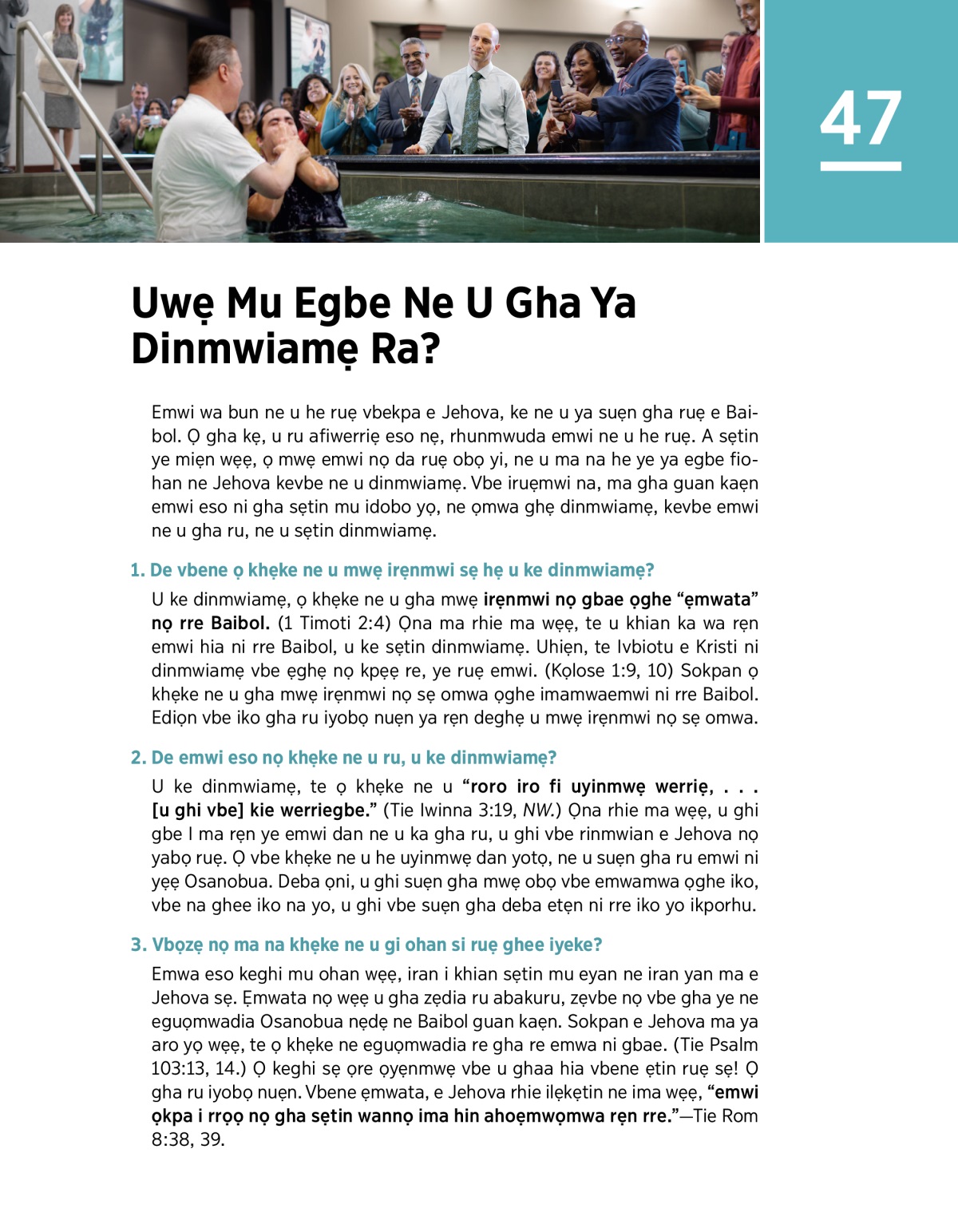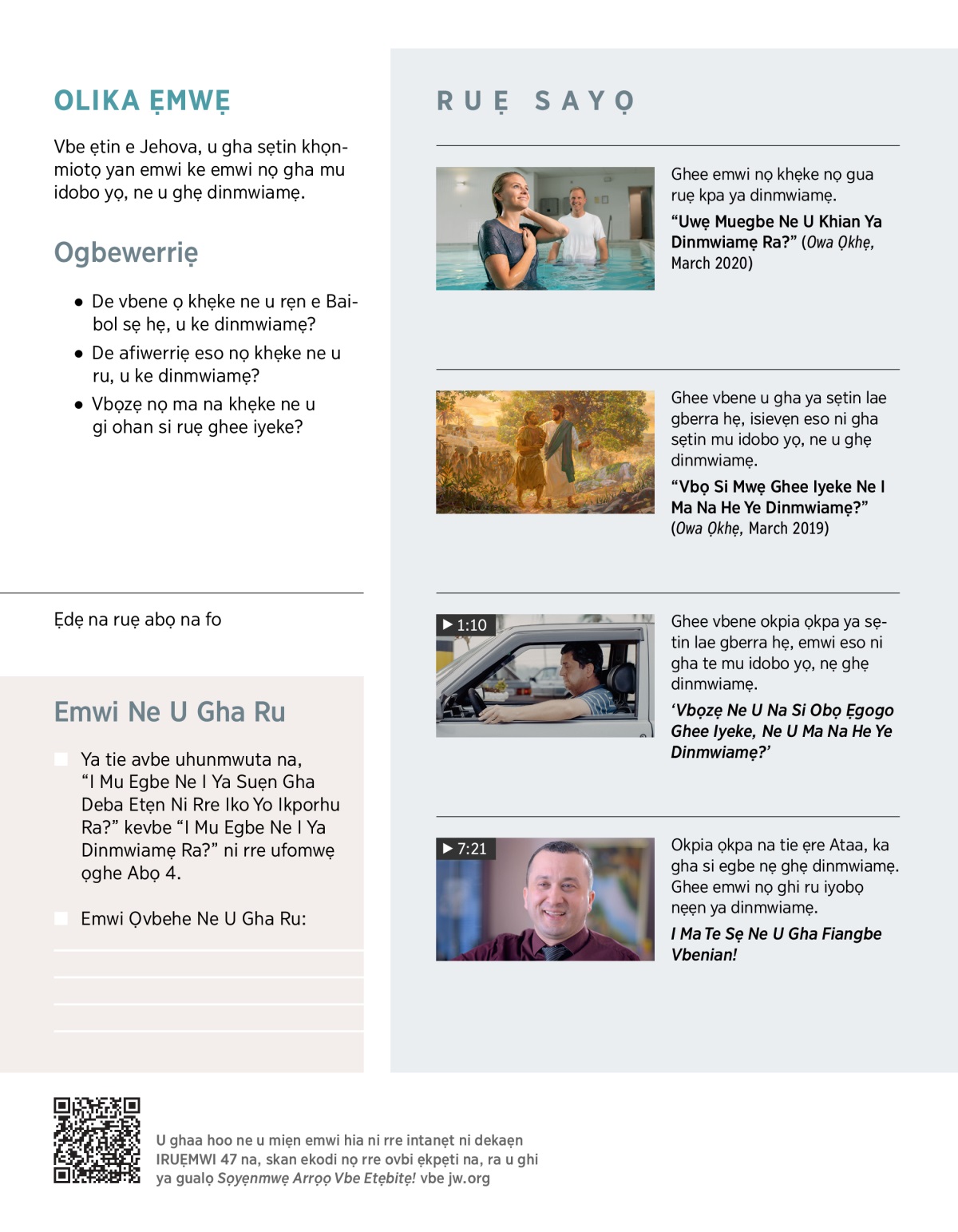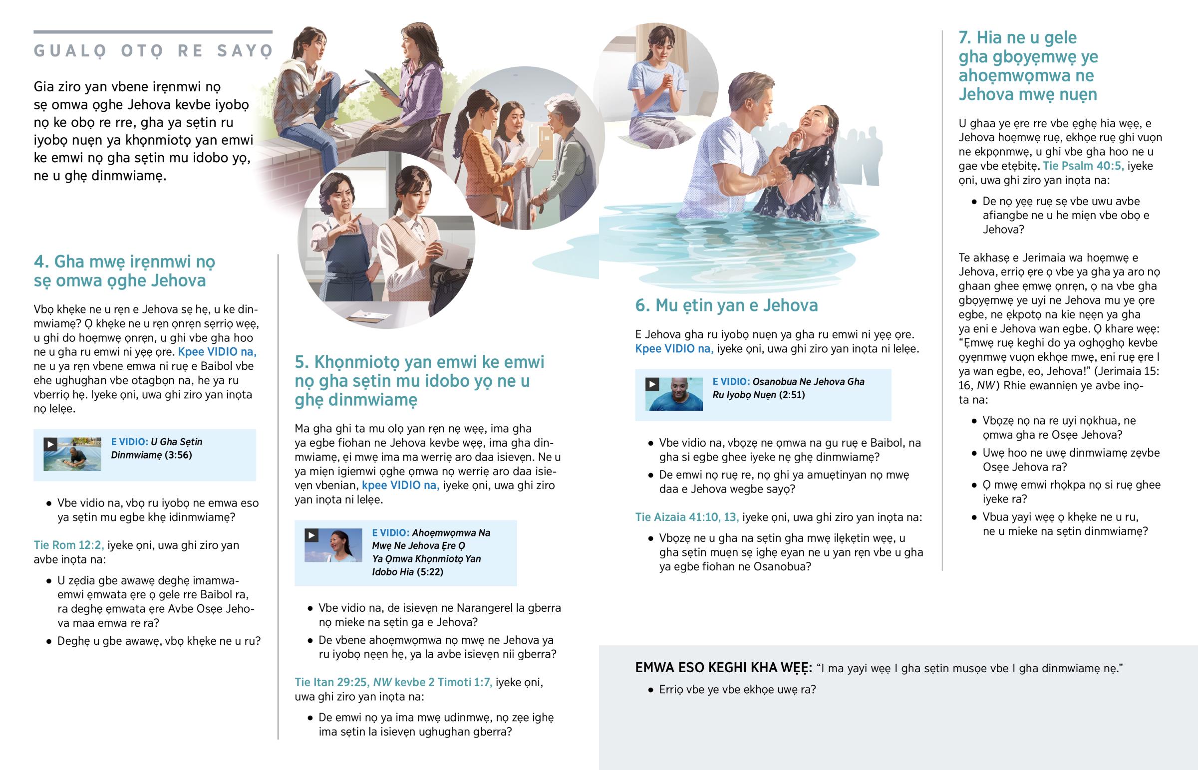 Ma gha ghi ta mu olọ yan rẹn nẹ wẹẹ, ima gha ya egbe fiohan ne Jehova kevbe wẹẹ, ima gha dinmwiamẹ, ẹi mwẹ ima ma werriẹ aro daa isievẹn. Ne u ya miẹn igiemwi ọghe ọmwa nọ werriẹ aro daa isievẹn vbenian, kpee VIDIO na, iyeke ọni, uwa ghi ziro yan inọta ni lelẹe.