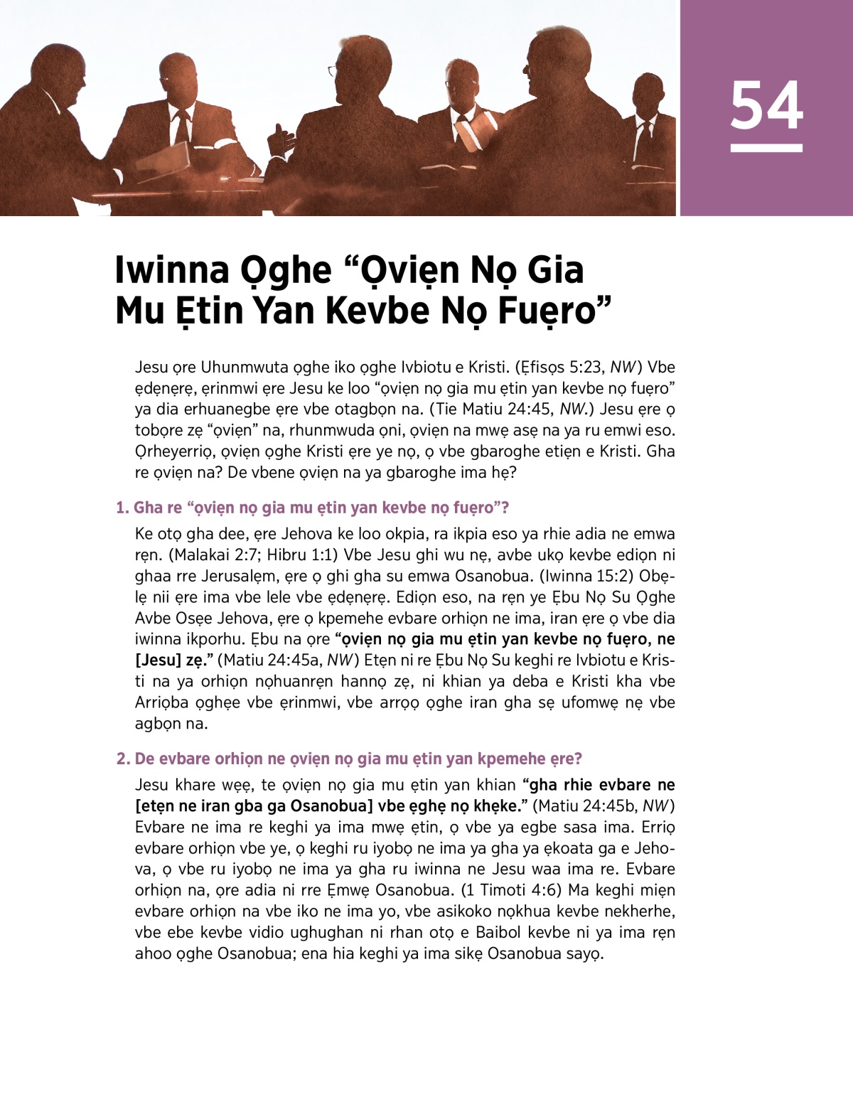 Ke otọ gha dee, ẹre Jehova ke loo okpia, ra ikpia eso ya rhie adia ne emwa rẹn. (Malakai 2:7; Hibru 1:1) Vbe Jesu ghi wu nẹ, avbe ukọ kevbe ediọn ni ghaa rre Jerusalẹm, ẹre ọ ghi gha su emwa Osanobua. (Iwinna 15:2) Obẹlẹ nii ẹre ima vbe lele vbe ẹdẹnẹrẹ. Ediọn eso, na rẹn ye Ẹbu Nọ Su Ọghe Avbe Osẹe Jehova, ẹre ọ kpemehe evbare orhiọn ne ima, iran ẹre ọ vbe dia iwinna ikporhu. Ẹbu na ọre “ọviẹn nọ gia mu ẹtin yan kevbe nọ fuẹro, ne [Jesu] zẹ.” (Matiu 24:45a, NW) Etẹn ni re Ẹbu Nọ Su keghi re Ivbiotu e Kristi na ya orhiọn nọhuanrẹn hannọ zẹ, ni khian ya deba e Kristi kha vbe Arriọba ọghẹe vbe ẹrinmwi, vbe arrọọ ọghe iran gha sẹ ufomwẹ nẹ vbe agbọn na.