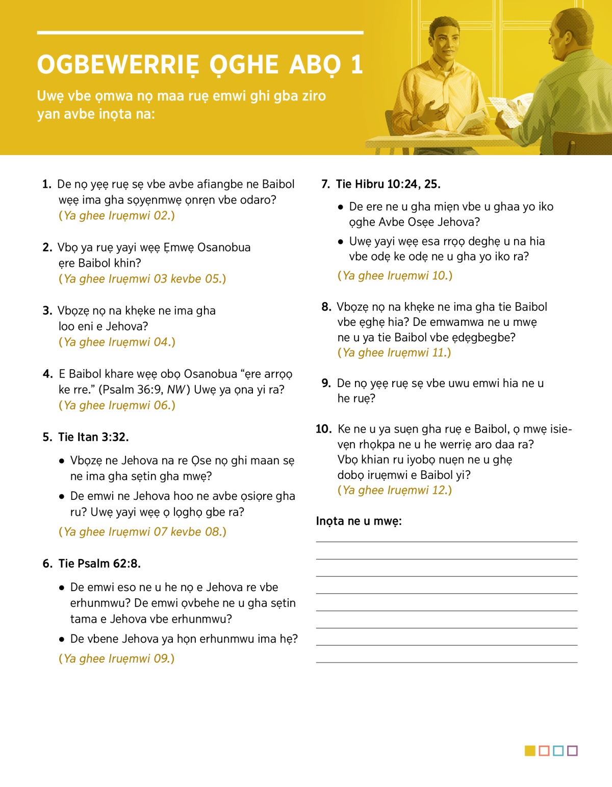 Ke ne u ya suẹn gha ruẹ e Baibol, ọ mwẹ isievẹn rhọkpa ne u he werriẹ aro daa ra? Vbọ khian ru iyobọ nuẹn ne u ghẹ dobọ iruẹmwi e Baibol yi?
