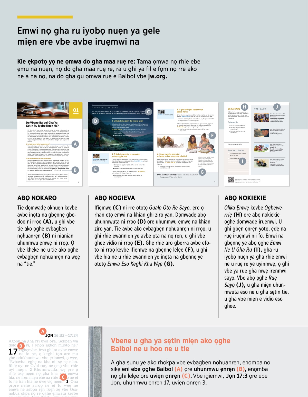 Kie ẹkpotọ yọ ne ọmwa do gha maa ruẹ re: Tama ọmwa nọ rhie ebe ẹmu na nuẹn, nọ do gha maa ruẹ re, ra u ghi ya fil e fọm nọ rre ako ne a na nọ, na do gha gu ọmwa ruẹ e Baibol vbe jw.org.