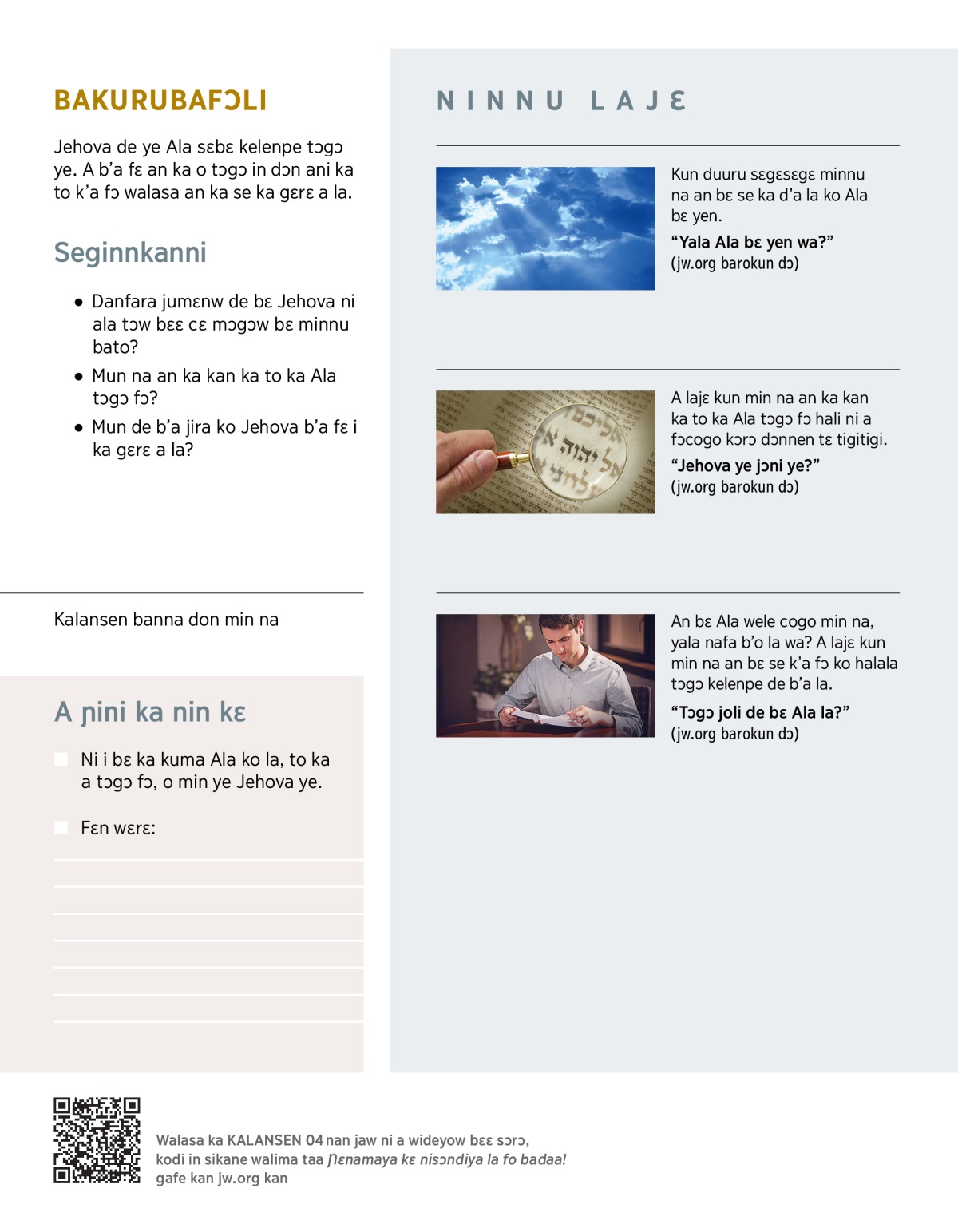 “Yala Ala bɛ yen wa?” (jw.org barokun dɔ)