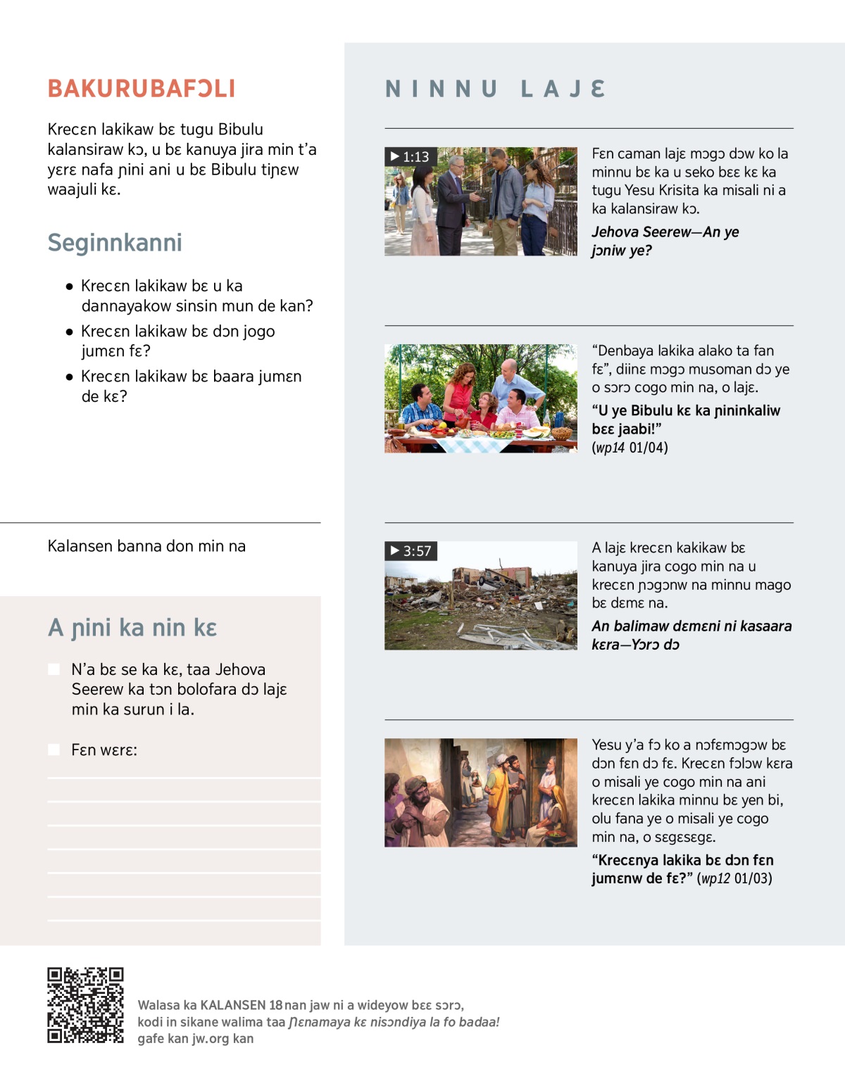 Krecɛnw ye Yesu Krisita ka kalandenw ye, fɔcogo wɛrɛ la, a nɔfɛmɔgɔw. (Kɛwalew 11:26 kalan.) U b’a jira cogo di ko u ye Yesu ka kalandenw ye? Yesu y’a fɔ ko: “Ni aw ye ne ka kumakan minɛ ka to a kan, aw na kɛ ne ka kalandenw ye sɛbɛ la.” (Yuhana 8:31) O kɔrɔ ye ko krecɛn lakikaw ka kan ka Yesu ka kalansiraw waleya. Ikomi Yesu tun bɛ to k’a ka kalansiraw sinsin Sɛbɛnniw kan, krecɛn lakikaw fana ka kan ka u ka dannayakow sinsin Bibulu kan.—Luka 24:27 kalan.