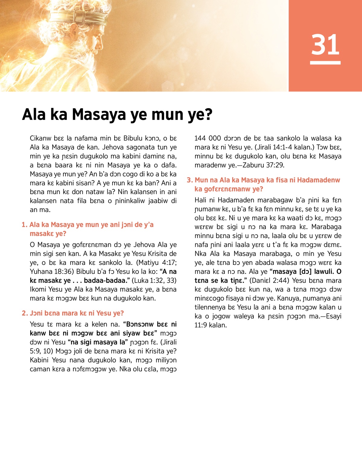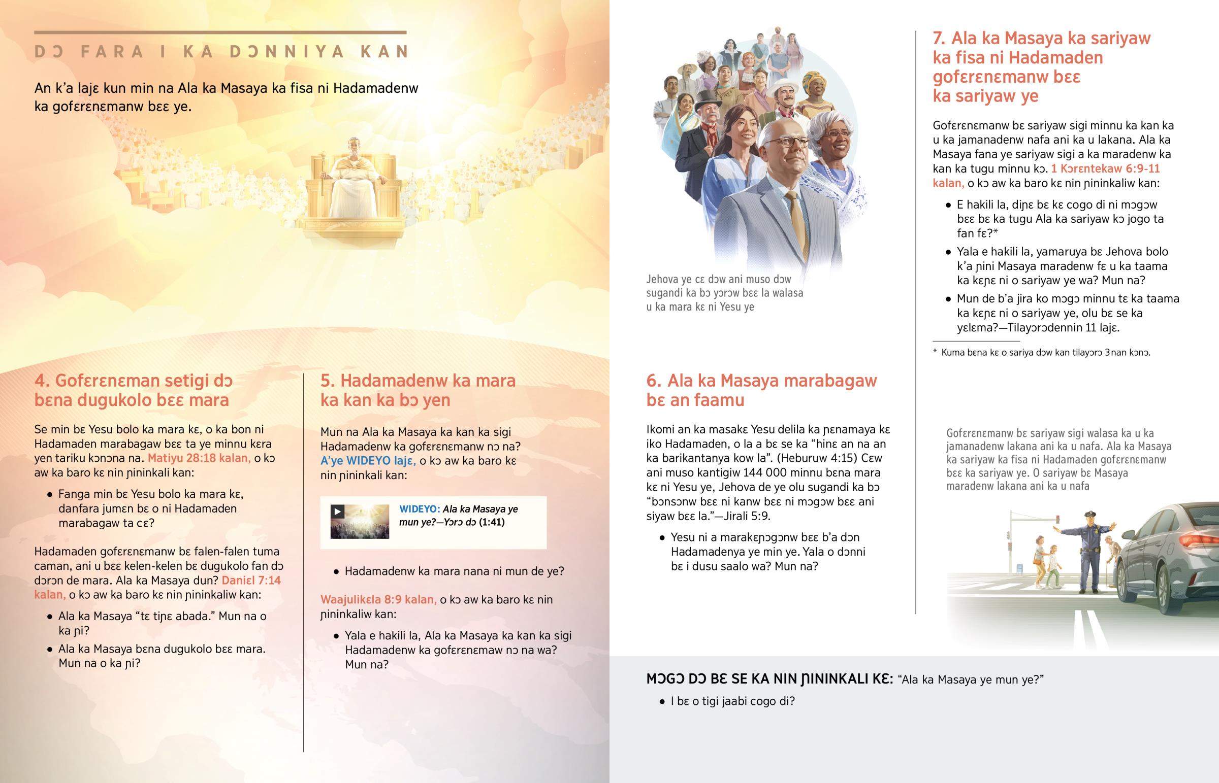 Cikanw bɛɛ la nafama min bɛ Bibulu kɔnɔ, o bɛ Ala ka Masaya de kan. Jehova sagonata tun ye min ye ka ɲɛsin dugukolo ma kabini daminɛ na, a bɛna baara kɛ ni nin Masaya ye ka o dafa. Masaya ye mun ye? An b’a dɔn cogo di ko a bɛ ka mara kɛ kabini sisan? A ye mun kɛ ka ban? Ani a bɛna mun kɛ don nataw la? Nin kalansen in ani kalansen nata fila bɛna o ɲininkaliw jaabiw di an ma.