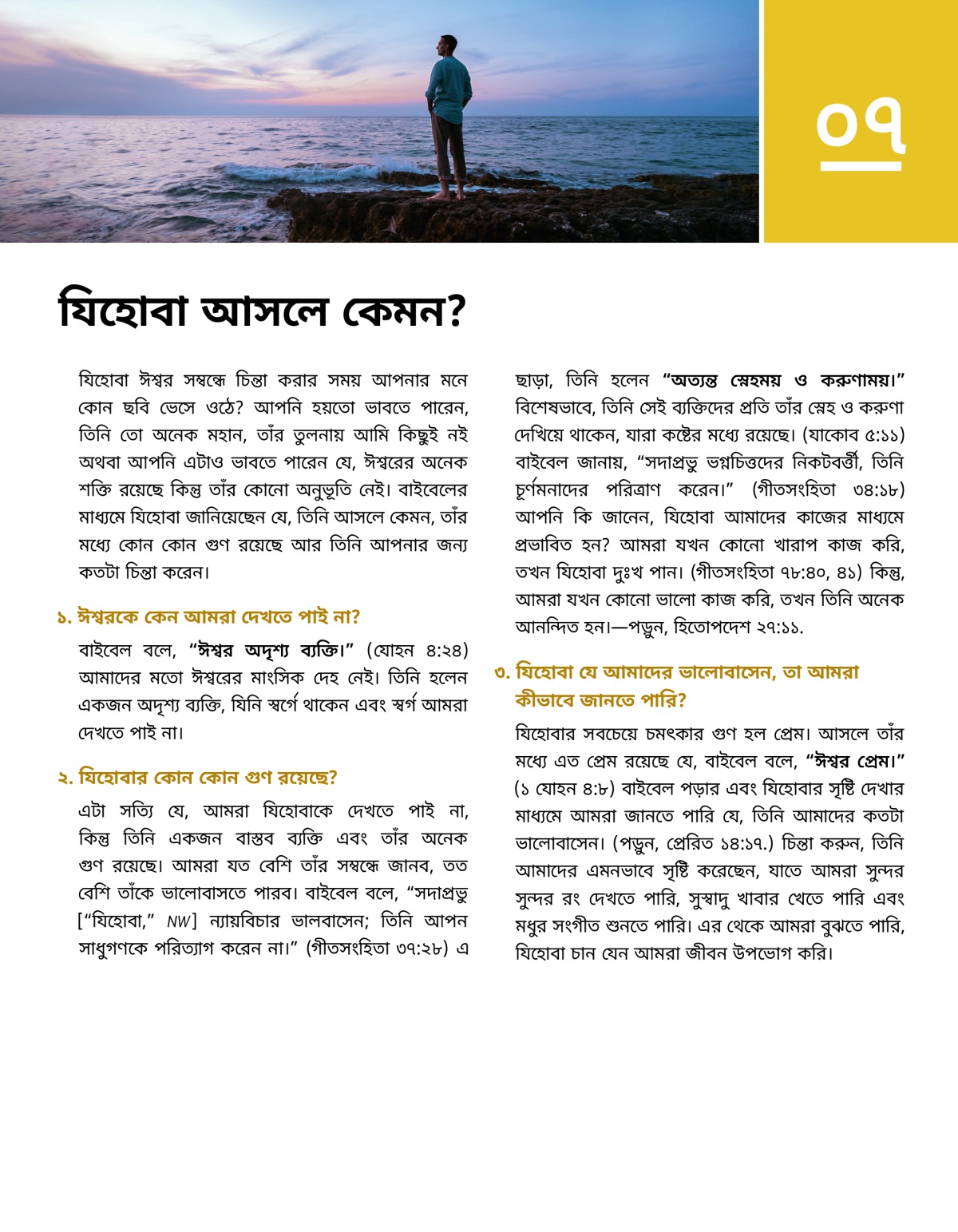 যিহোবা ঈশ্বর সম্বন্ধে চিন্তা করার সময় আপনার মনে কোন ছবি ভেসে ওঠে? আপনি হয়তো ভাবতে পারেন, তিনি তো অনেক মহান, তাঁর তুলনায় আমি কিছুই নই অথবা আপনি এটাও ভাবতে পারেন যে, ঈশ্বরের অনেক শক্তি রয়েছে কিন্তু তাঁর কোনো অনুভূতি নেই। বাইবেলের মাধ্যমে যিহোবা জানিয়েছেন যে, তিনি আসলে কেমন, তাঁর মধ্যে কোন কোন গুণ রয়েছে আর তিনি আপনার জন্য কতটা চিন্তা করেন।