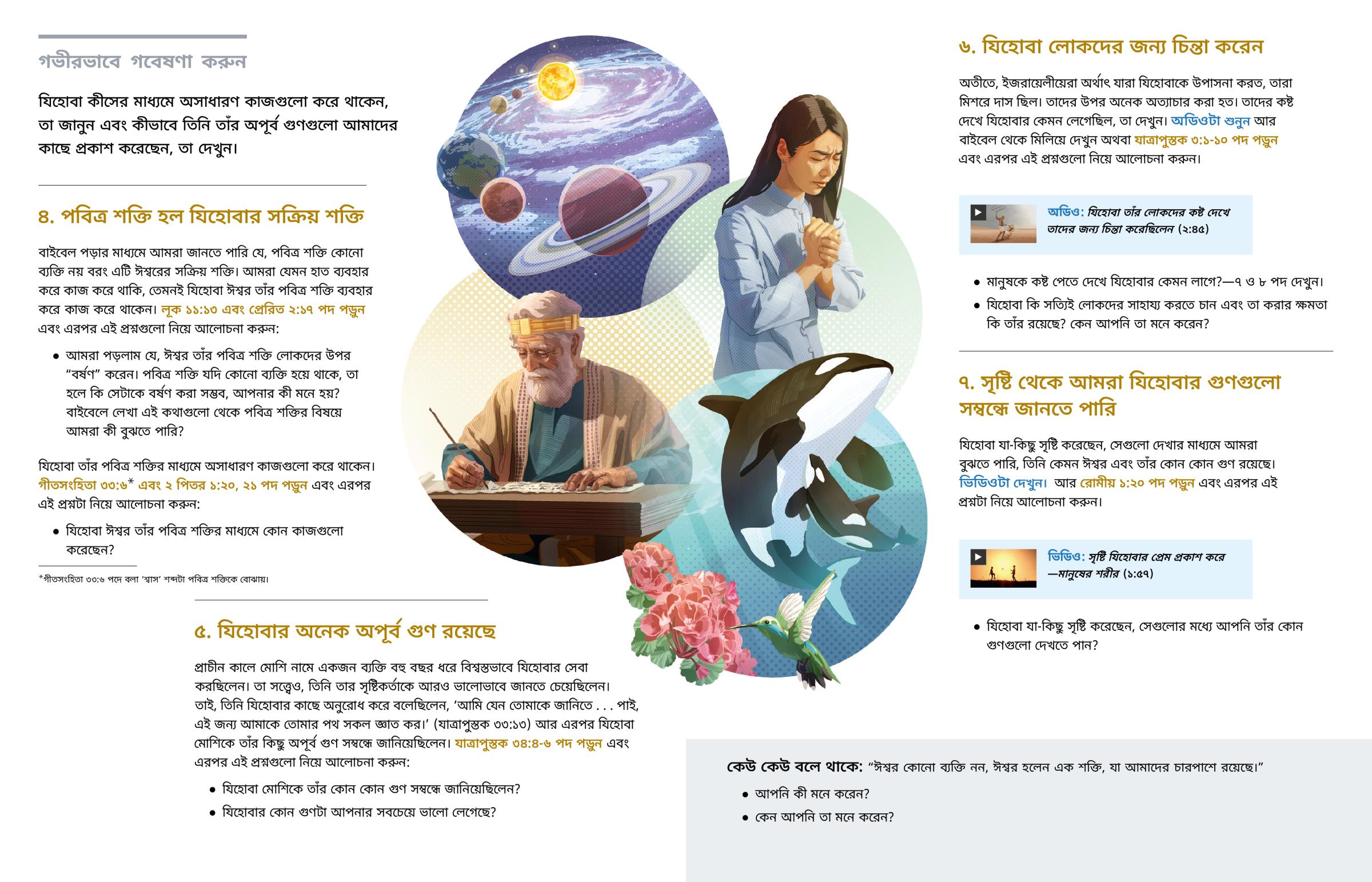 যিহোবা যা-কিছু সৃষ্টি করেছেন, সেগুলো দেখার মাধ্যমে আমরা বুঝতে পারি, তিনি কেমন ঈশ্বর এবং তাঁর কোন কোন গুণ রয়েছে। ভিডিওটা দেখুন। আর রোমীয় ১:২০ পদ পড়ুন এবং এরপর এই প্রশ্নটা নিয়ে আলোচনা করুন।
